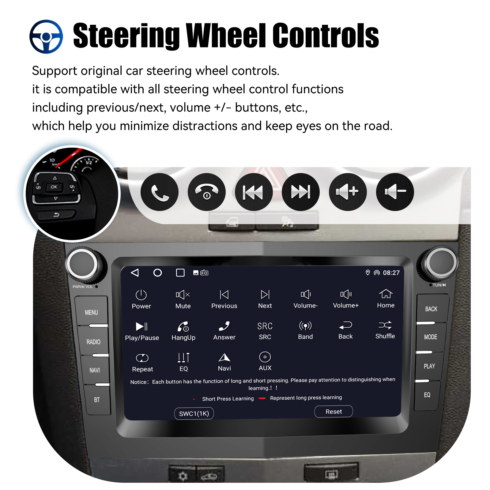 AHD Rear View Camera Input & Steering Wheel Control: After connecting to the rear view camera. The radio automatically displays the reversing image as soon as you engage reverse gear. Make your daily reversing safer. Support AHD camera. Support original car steering wheel control to make driving more convenient and safer.