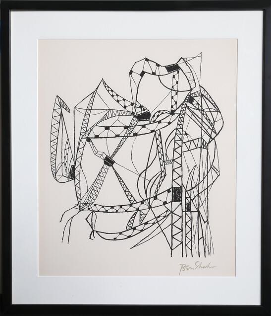 Cette lithographie provient du portefeuille de Rilke par Ben Shahn, qui est la réponse de l'artiste au travail de la poète autrichienne Rainer Maria Rilke (1875-1926). Comme de nombreux poètes de l'époque, le travail de Rilke se concentre sur le sublime de la nature et le réconfort et la perfection trouvés à travers les pratiques religieuses. Shahn capture la nature douloureuse de cette poésie à travers ses empreintes, qui sont toutes signées dans l'assiette.