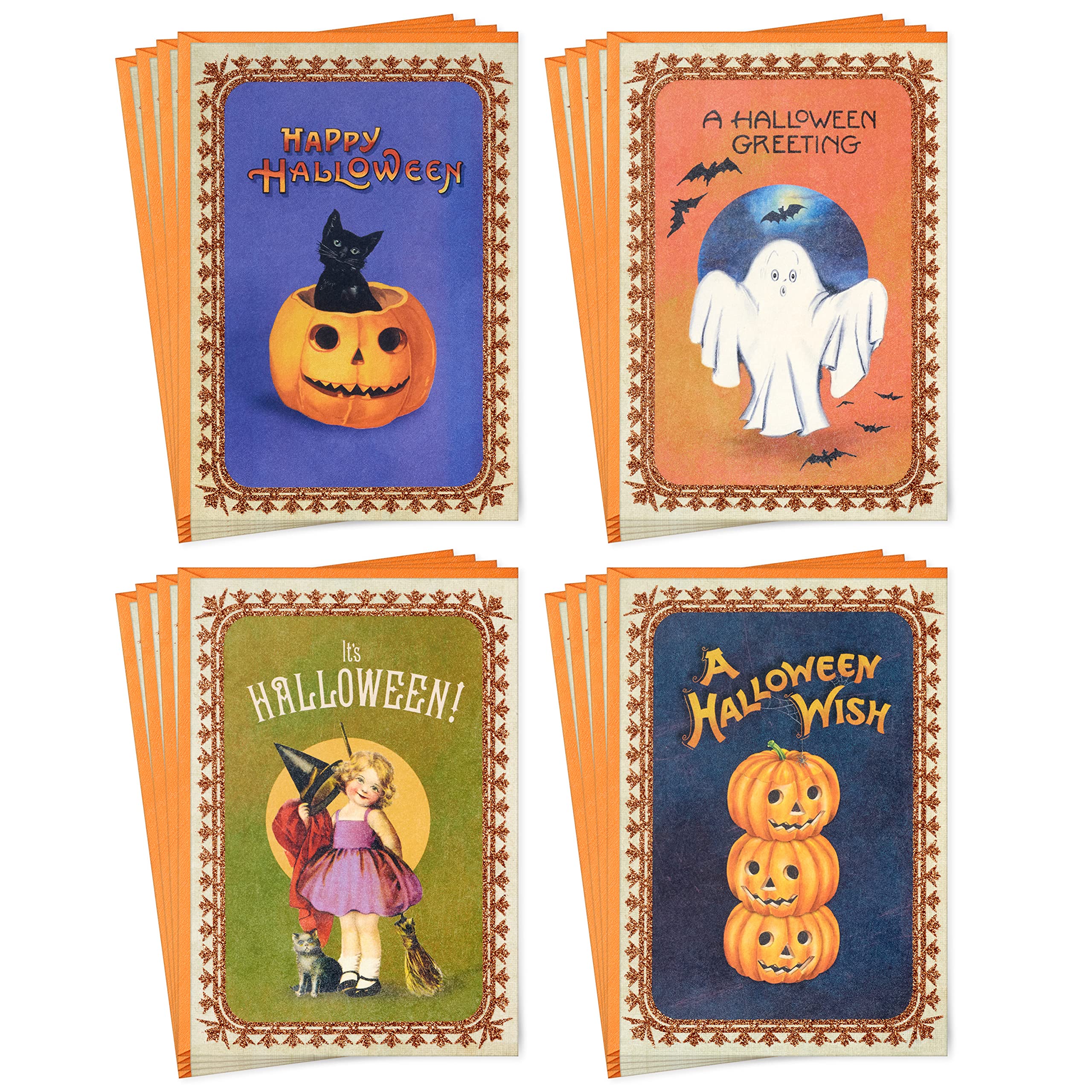 Send a festive treat to your favorite people with this pack of vintage Halloween cards featuring seasonal icons and cheerful sentiments. With glittery old-timey designs and plenty of room to write your own personalized message inside, they're sure to get ghosts and ghouls near and far in the Halloween spirit. A handwritten note is the perfect way to scare up some smiles at the spookiest time of the year, and these are a great accompaniment to Halloween gifts of all kinds. The Hallmark brand is widely recognized as the very best for Cards, gift wrap, and more. For more than 100 years, Hallmark has been helping its customers make everyday moments more beautiful and celebrations more joyful.