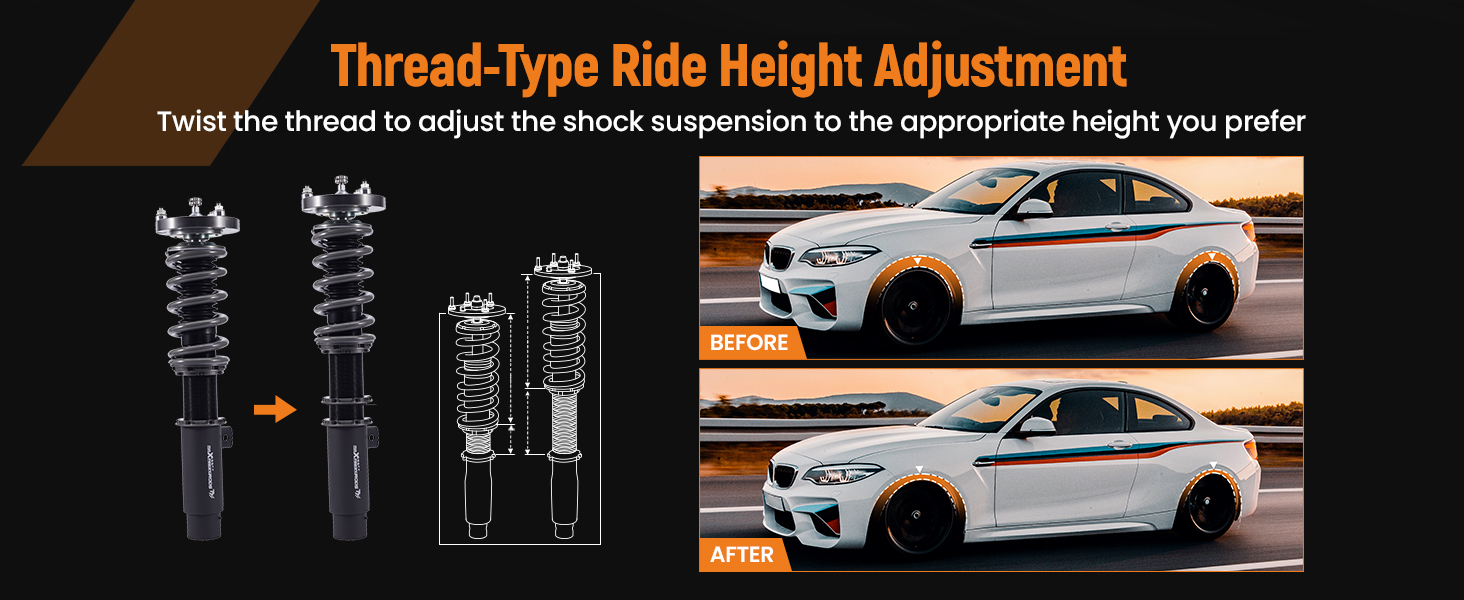 - Lowered height adjustment from 1" - 3" (depending on vehicle models) which adds a more aggressive stance and a lower center of gravity.
