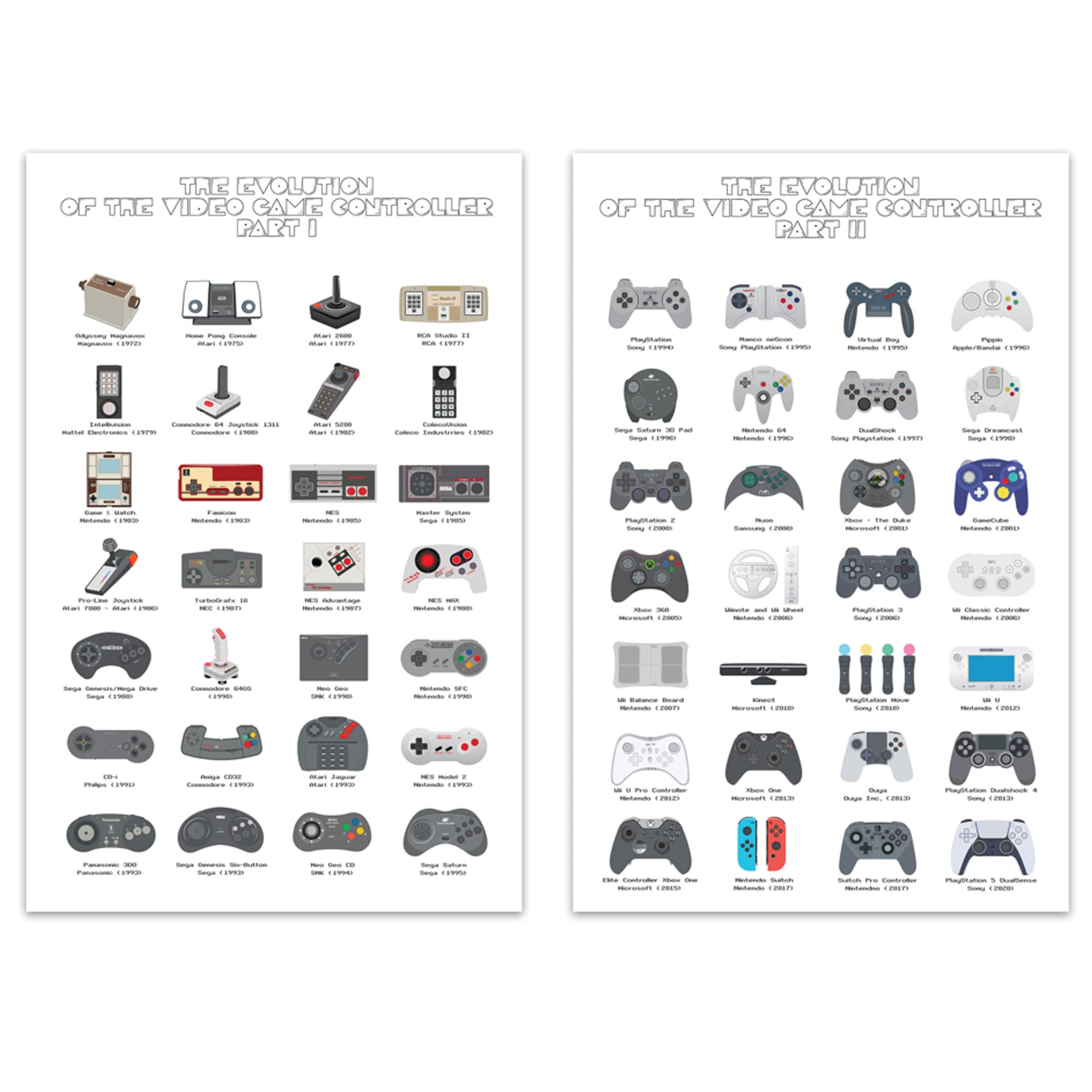 THE EVOLUTION OF THE VIDEO GAME CONTROLLER POSTER: This 2-posters set gathers the 56 most memorable video game controllers of all time. Depicted with the help of eye-catching, high-definition art images, this collection features retro gaming control devices such as the Odyssey Magnavox of 1972 as well as many more familiar joysticks and famous dualshock controllers from the dawn of gaming.