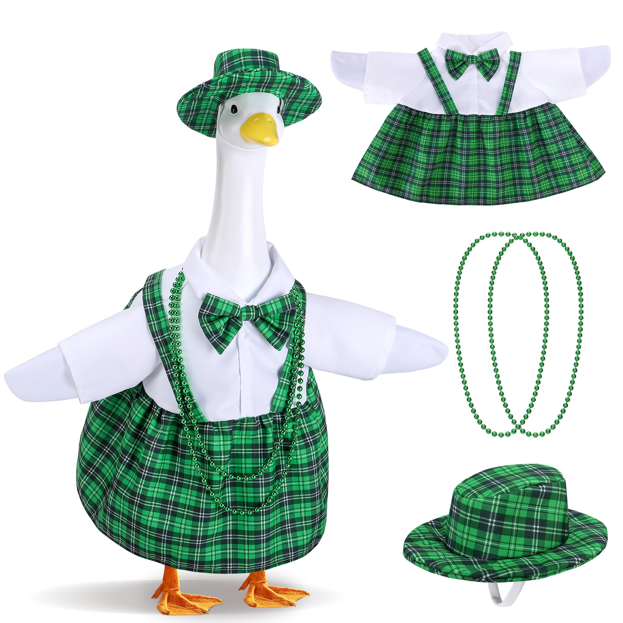 Watayo 4 Pcs/Set St. Patrick's Day Porch Goose Outfits, Lawn Goose Statue Green Plaid Costume, Irish Green Garden Goose Clothes Dress Hat and Bead Necklaces for 23" High Statue Patio Yard DecorPackage includes:4 Pcs x St. Patrick's Day Porch Goose OutfitsSpecification:Color: green, whiteMaterial: clothFeatures:(1)Complete accessories, easy to wear or take off, allow your goose statue to enjoy the festive look and enhance the atmosphere of outdoor decor.(2)The porch goose costume with green plaid as the theme, fake two-piece clothing design with playful bow tie, green plaid top hat and bead necklaces to make your goose statue look lively, interesting and full of charm.(3)It can be used for St. Patrick's Day, themed party, garden party, community activity and other daily decoration, used outdoor, porch, garden, lawn, yard, patio, etc., to turn ordinary lawns into charming garden centerpieces.