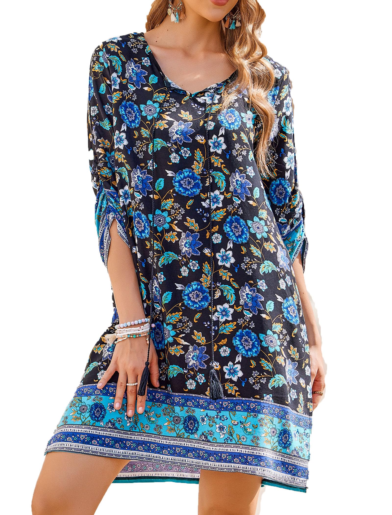 HOTOUCH Women Casual Beach Summer Dress Boho Tassel Tie Neck 3/4 Long Sleeve Short Floral Print Flowy Cover Up Sundresses Inky Blue S