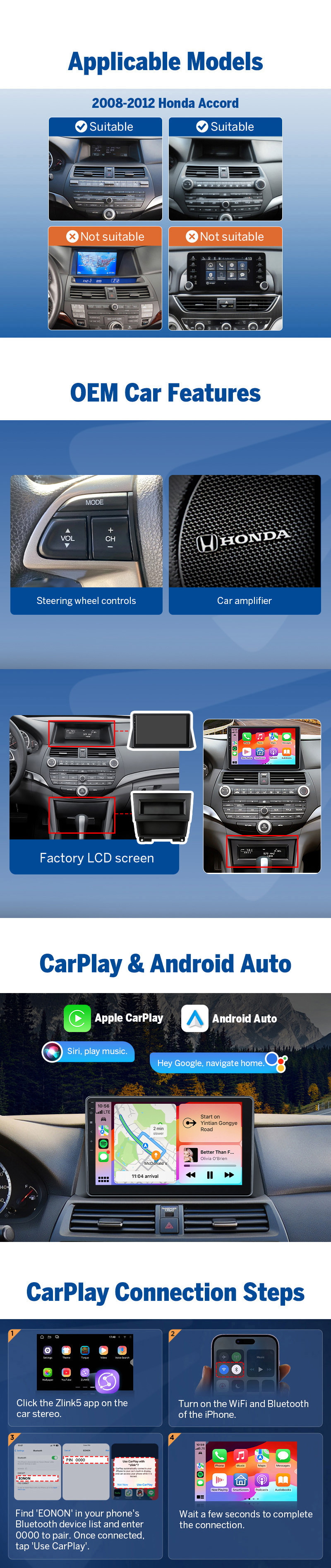 β FAQ Q: Will this fit my Accord without cutting wires? Q: Will I lose steering wheel controls or factory amplifier? Q: Is wireless CarPlay / Android Auto stable? Q: Can I use navigation without internet? Q: Can I play music without internet? Q: How is the sound quality compared to stock? Q: Can the audio be upgraded further? Q: Does it support DAB+ digital radio? Q: How long does installation take?