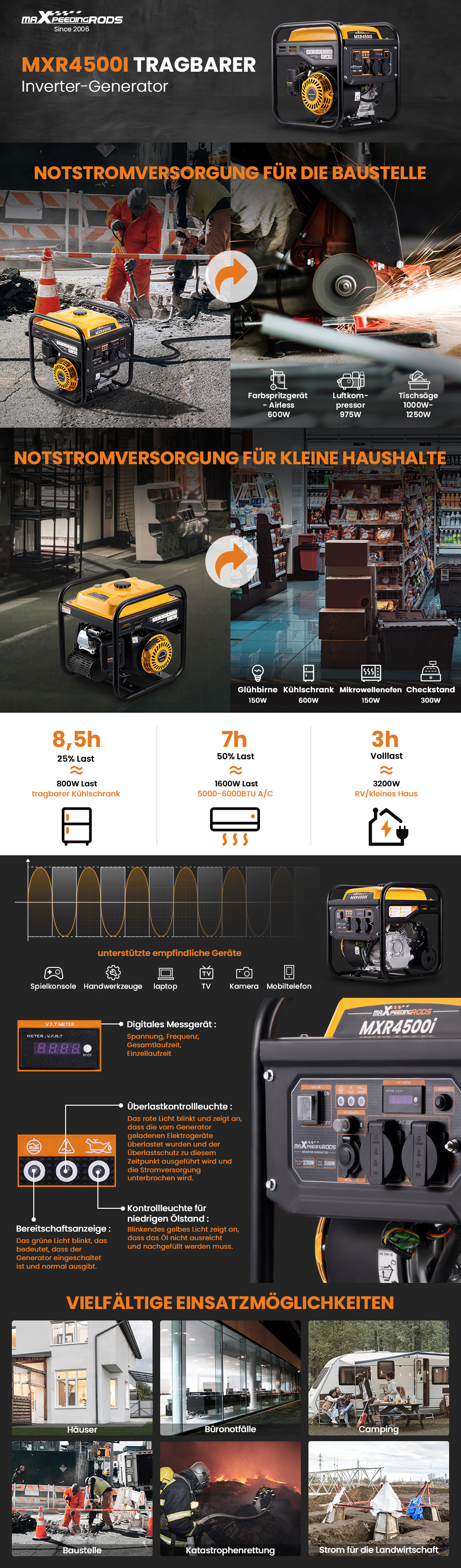 • Leiser Betrieb, perfekt for Wohnmobilreisen, Familiennotstrom, Baustelleneinsatz usw.