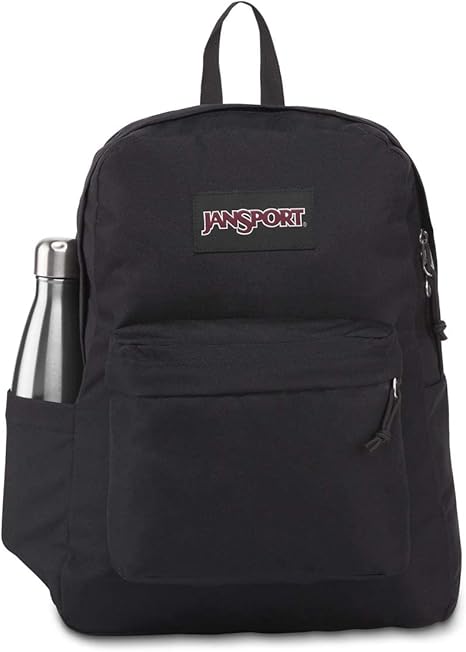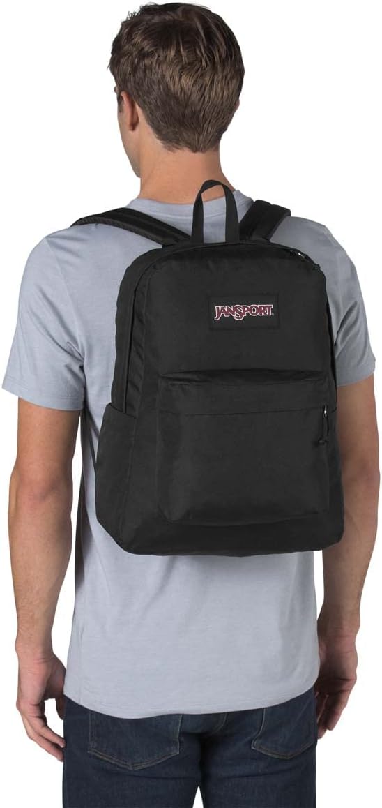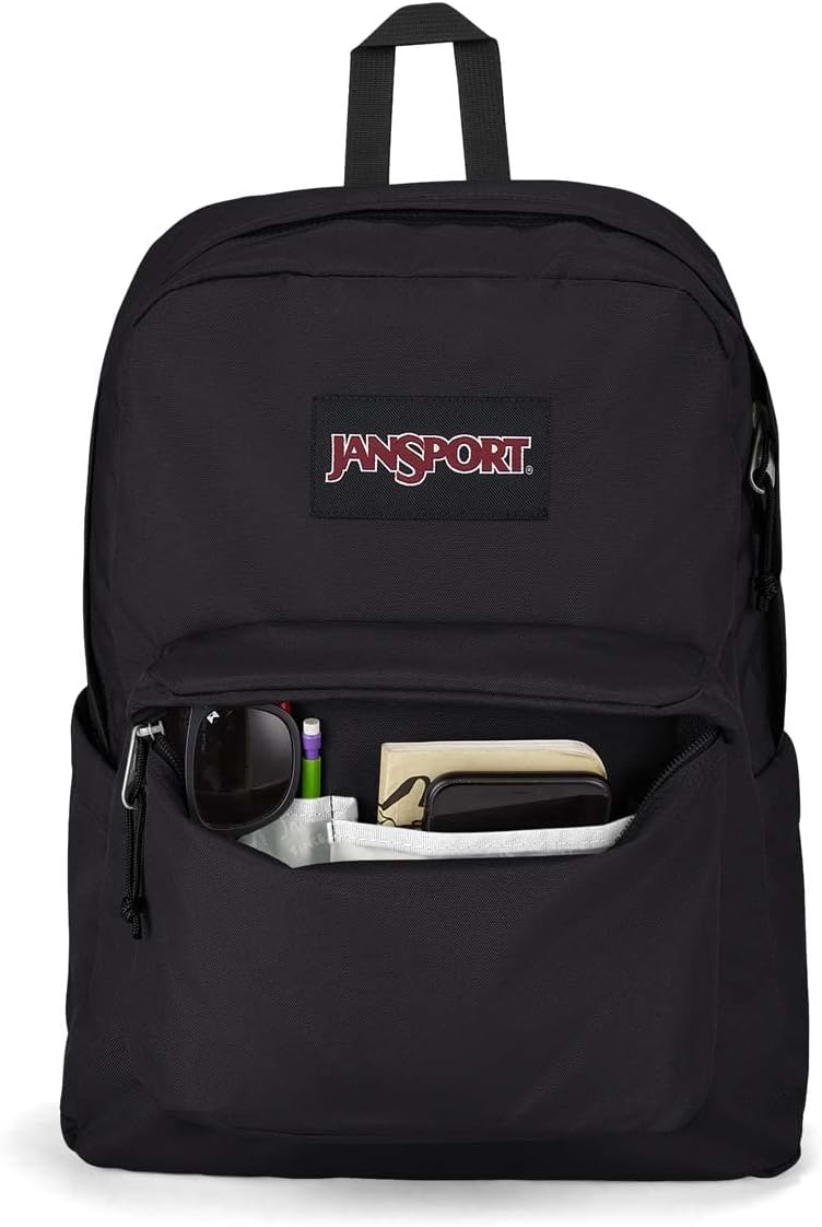 The JanSport SuperBreak Plus Backpack in Black is a spacious, durable daypack perfect for work, school, or travel. With a roomy main compartment measuring 16.5 x 12.5 x 5.5 inches, it easily stores clothes, books, and essentials. The interior padded 15-inch laptop sleeve protects your device from bumps and drops. For enhanced comfort, adjustable straight-cut padded shoulder straps and a fully padded back panel make carrying heavy loads easier. Keep your items organized with the front utility pocket featuring a built-in organizer and a seamlessly integrated side bottle pocket. A durable web haul handle provides easy grab-and-go accessibility. Designed for daily use and for ages 13 and up, this backpack combines functionality with classic style.