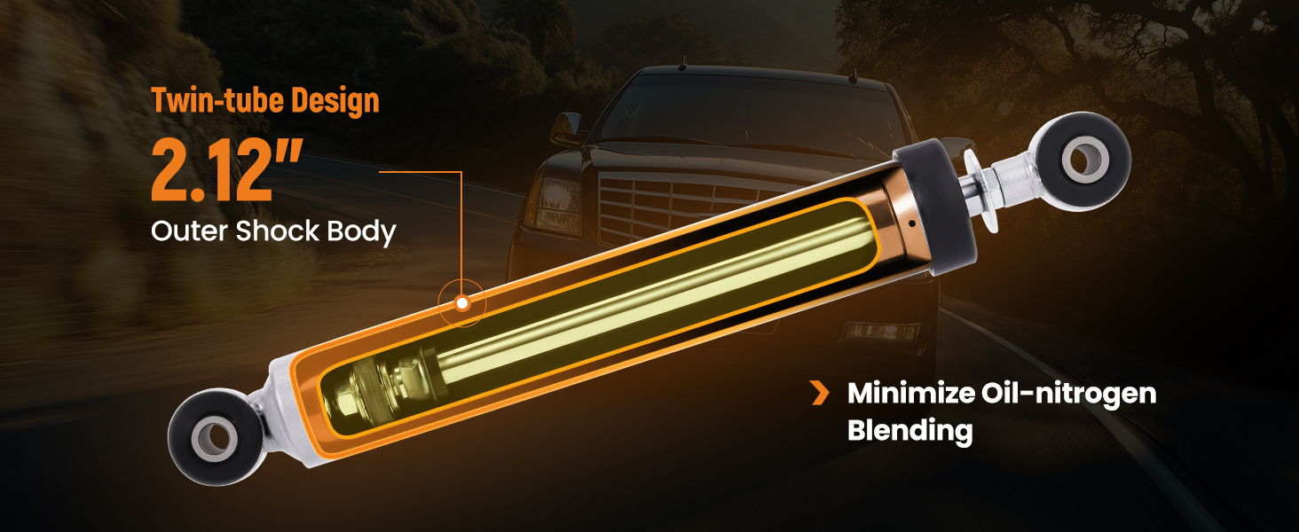 Premium twin-tube shock absorber charged with high-pressure nitrogen, engineered for maximum durability and consistent performance.