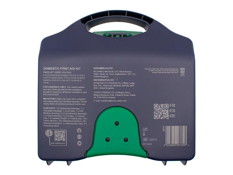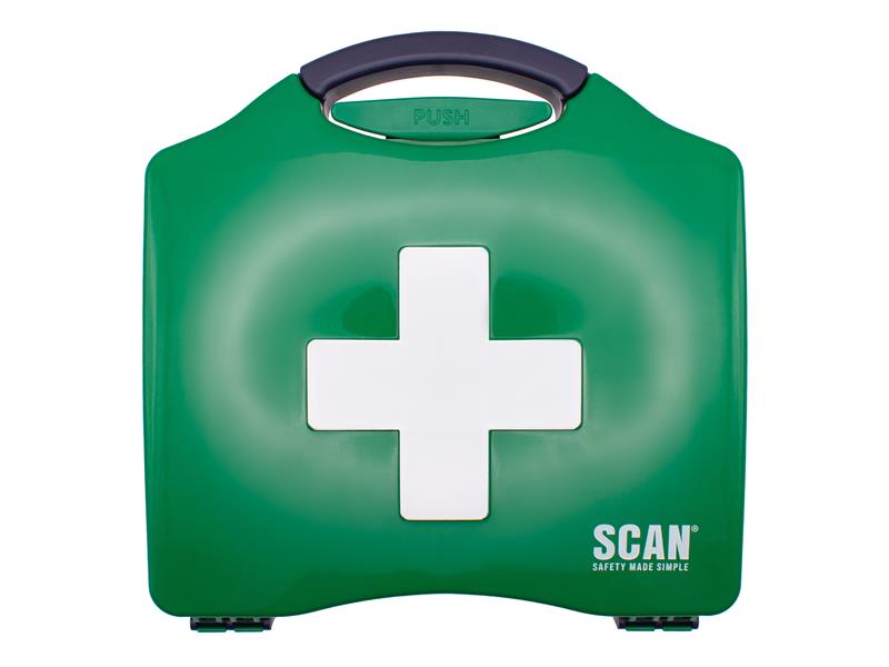Trousse de premiers secours Scan à usage général fournie dans une boîte compacte de style mallette en polycarbonate. Convient pour les voyages, les loisirs et un usage domestique général. Livré avec un support de suspension murale.