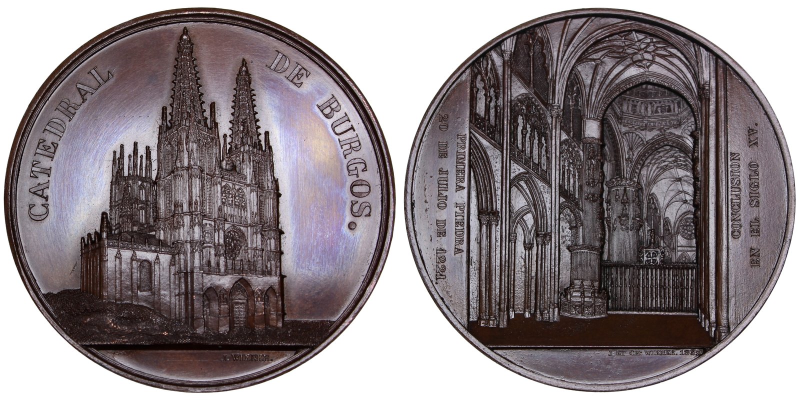 103156 | SPAIN. Burgos. Cathedral of St. Maria bronze Medal. Issued 1867. Most Remarkable Edifices of Europe series (59mm, 105.01 g, 12h). By Jacques & Charles Wiener in Brussels and struck at the Geerts mint in Ixelles. CATEDRAL DE BURGOS, perspective view of the cathedral exterior from the northwest // PRIMERA PIEDRA 20 DE JULIO DE 1221 / CONCLUSION EN EL SIGLO XV, view of the cathedral interior looking from the north transept towards the south. Edge: A few scattered marks, otherwise plain; thickness: 7mm. Ross M282 (R1); van Hoydonck 220; Reinecke 58. Choice Mint State. Rich brown surfaces, with great glossiness in the fields; a minor spot of corrosion is noted in the obverse field. Incredibly deep on the reverse, this type features some of the strongest relief—if not the strongest relief—in the entire series. Compare to a similar example in Stack's Bowers CCO (27 February 2023), lot 71296 (which realized a total of $1,560).
