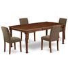 The DOAB5-MAH-18 dining set facilitates an affectionate family feeling. A comfortable and classy Mahogany color offers any dining area a relaxing and friendly feel with the rectangular kitchen table. This well-designed and comfortable dining table may be used for hours at a time. This wonderful smooth Mahogany dinette table makes a really good addition for all kitchen space and corresponds all sorts of dining-room concepts. The dinette table is created from prime quality rubber wood known as Asian Hardwood. No heat treated pressured wood like MDF, particle board or veneer top fabricated. This simple but charming Parson chair will add ambiance and style to your dining-room. A contemporary twist on a classic design, this eye-catching design will liven up any look. The traditional parson gives this chair a touch of familiar charm, while the Linen Fabric-Coffee color and clean-lined design elevate this chair with modern flair. The frame of the dinette chairs are engineered to offer a great amount of comfort to your spine and thus reduce the chances of back pain. Straight legs gives this design a hint of well-worn style, while its arched silhouette and nail head trim round out the look with classic character. Just by switching out your old dining set with this one, you can effortlessly refresh your dining space. This budget friendly dining set can be good choice for a great dining experience with family and friends. Table Specifications: Material: Asian Hardwood Color: Mahogany Dimensions: Length 60 extend to 78; Width 42; Height 30 Weight Capacity: 300 lbs Chair Specifications: Frame Material: Asian Hardwood Fabric: Linen Fabric Cushion Material: Foam Fabric Color: Coffee Leg Color: Mahogany Dimensions: Length 21; Width 17; Height 35 Weight Capacity: 300 lbs Includes: 1 x Rectangular Table 4 x Parson Chair N.B.: Hardware package and instruction manual is located in/under the seat.