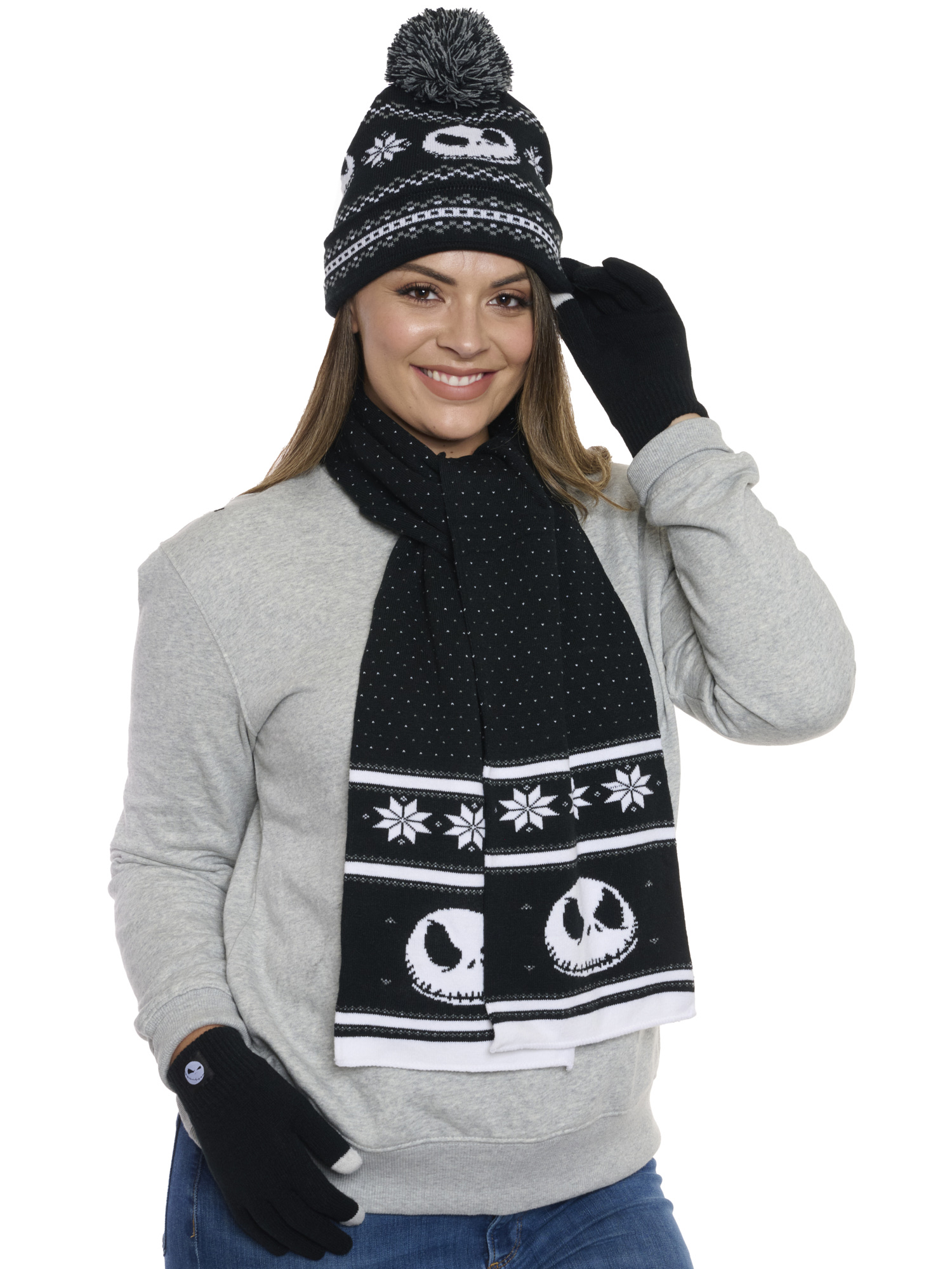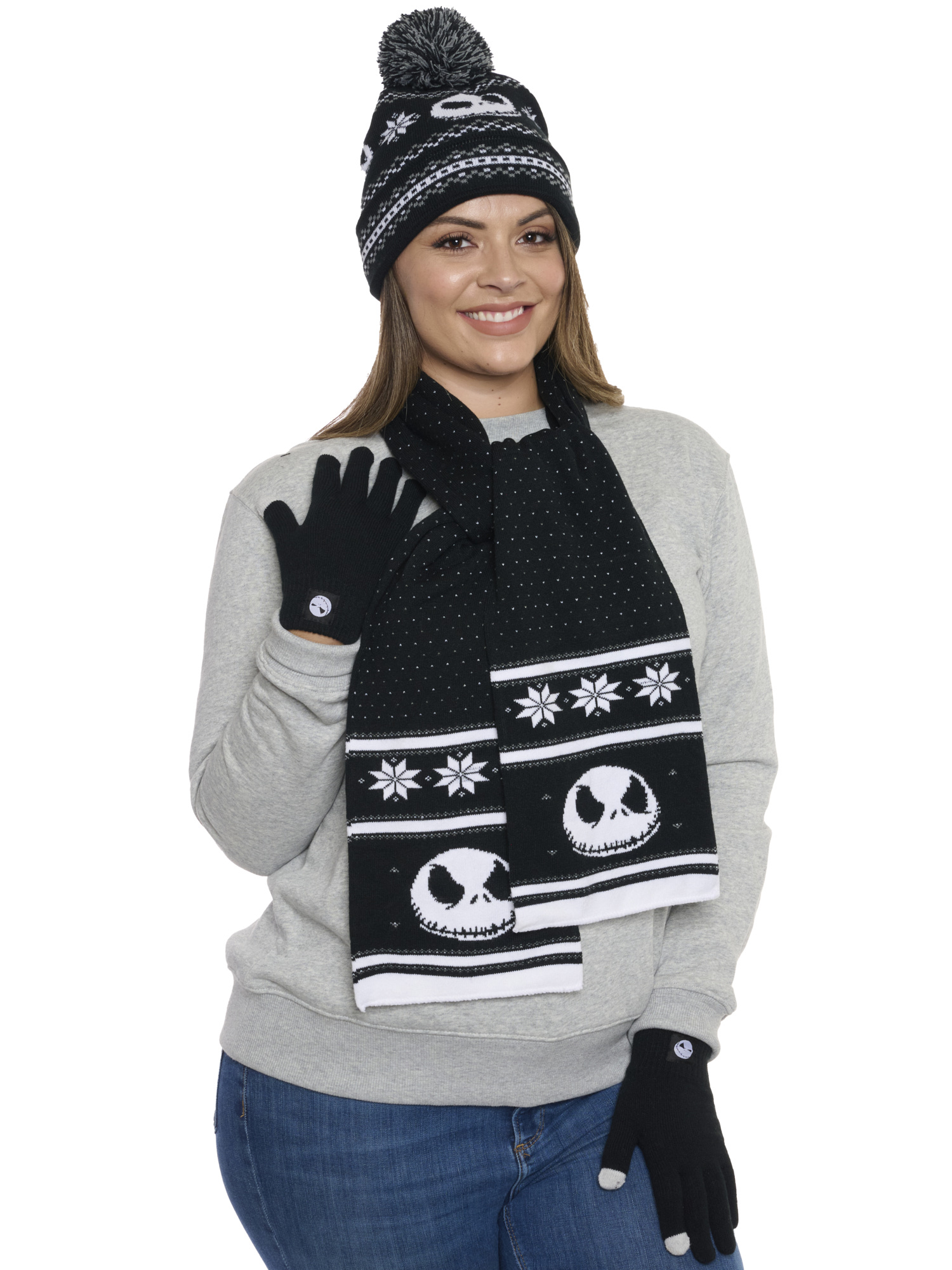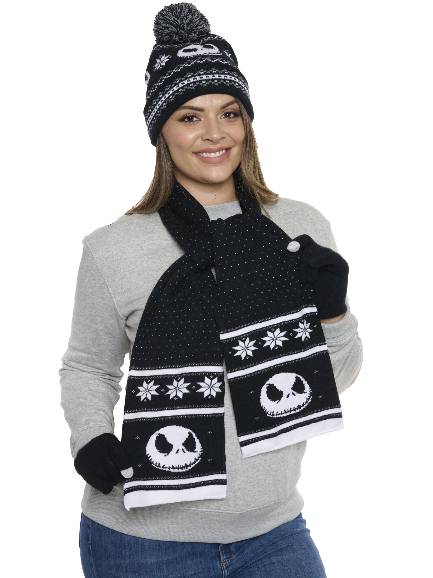 - Nightmare Before Christmas Knit Gift Set Includes: (1) Jack Skellington Knit Hat, (1) Jack Skellington Knit Scarf and (1) Set of Jack Skellington Knit Gloves.
