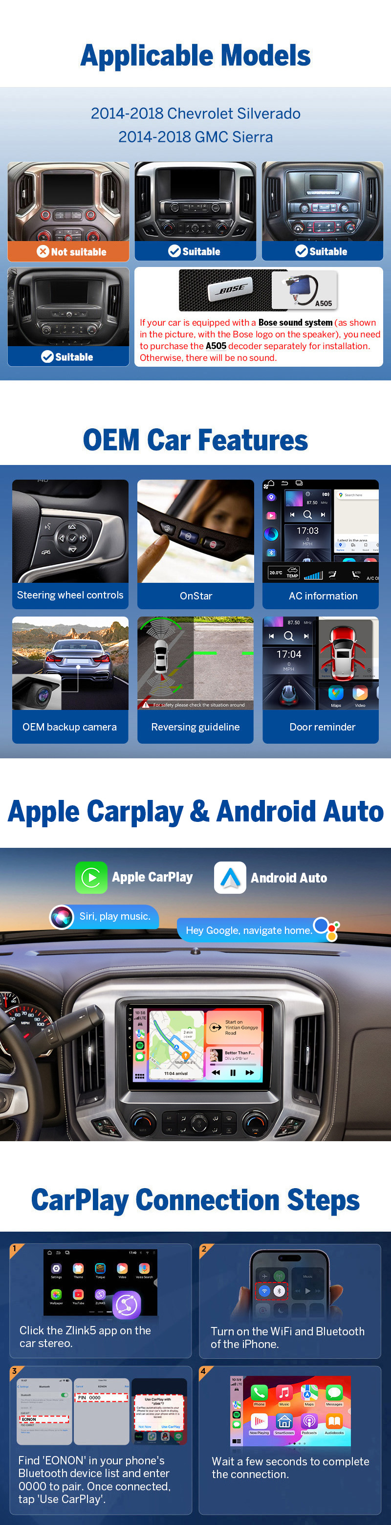 Upgrade your truck with a modern infotainment system that looks factory, installs easily, and performs like a flagship. The Eonon GMSX7 is engineered specifically for 2014–2018 Silverado & Sierra with true plug-and-play installation—no cutting, no rewiring. Enjoy Android 14 performance, wireless CarPlay/Android Auto, premium DSP sound, and full factory function retention.