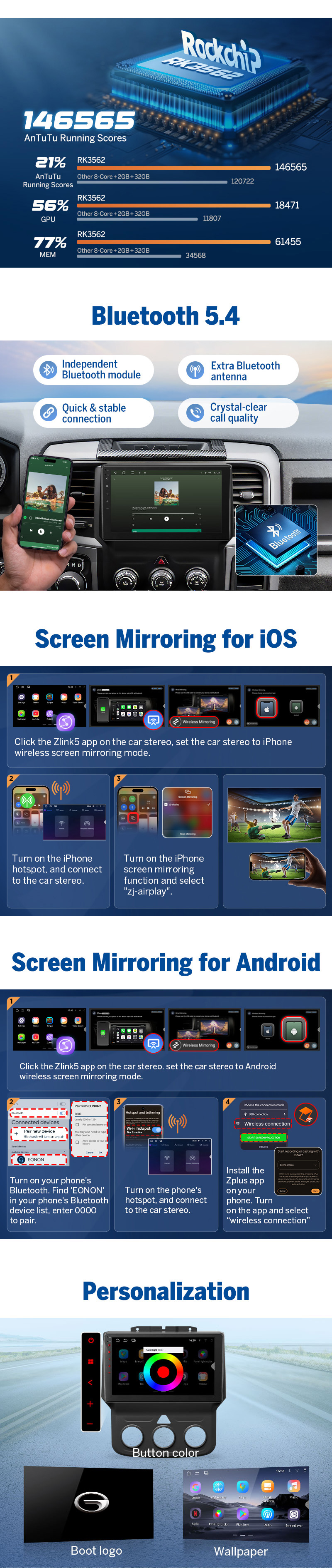 Upgrade your Dodge RAM with a premium Android version head unit featuring wireless CarPlay, Android Auto, and accurate GPS Navi for safer, smarter driving. This 2 DIN / double DIN touchscreen system offers smooth RAM/ROM performance, DSP-enhanced audio, WiFi 6 streaming, and Bluetooth 5.4 connectivity for hands-free calls and music. Designed for Plug & Play installation with CANBUS support, it retains factory features including steering wheel controls, seat heater display, and sensors. Split-screen multitasking allows navigation and media simultaneously, making it perfect for RAM 1500/2500/3500 (2013–2018) and RAM 1500 Classic (2019–2024, manual AC). Ideal for buyers seeking a reliable, Factory-style Android car stereo that delivers modern connectivity, responsive touchscreen controls, and enhanced in-cabin audio and entertainment for everyday driving or long trips.