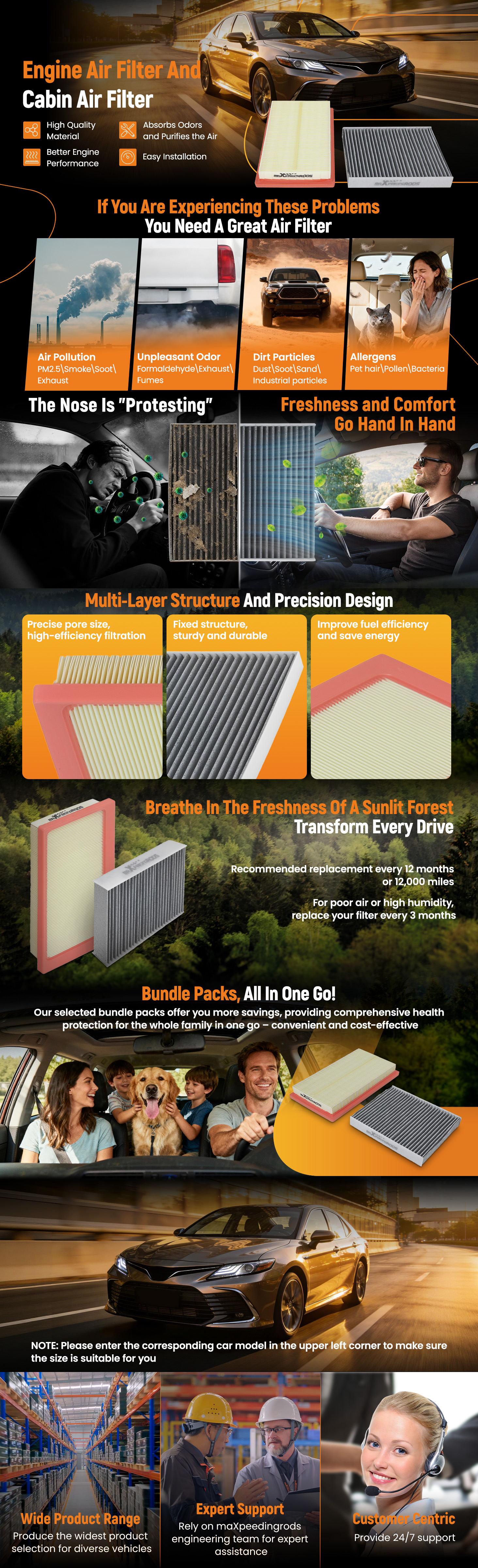 FUNCTION:Cabin Filters use premium coconut shell activated carbon to adsorb unpleasant odors, ensuring a fresh cenvironment for drivers and passengers. Engine Filters feature premium media and filter construction to provide expanded durability, maintaining long-term performance for your engine.