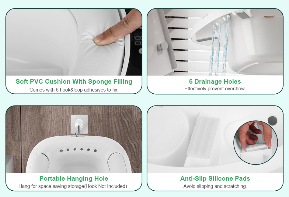 - Water Temperature Monitor & Display:Built in water monitor and equipped with water temperature LED display,helps you to view the real time water temperature,effectively prevent scalding or overheating. Besides,6 silicone pads can avoid slipping and scratching during using,and 6 hook&loop adhesives allow you to fix the sponge cushion in place or remove it as needed.