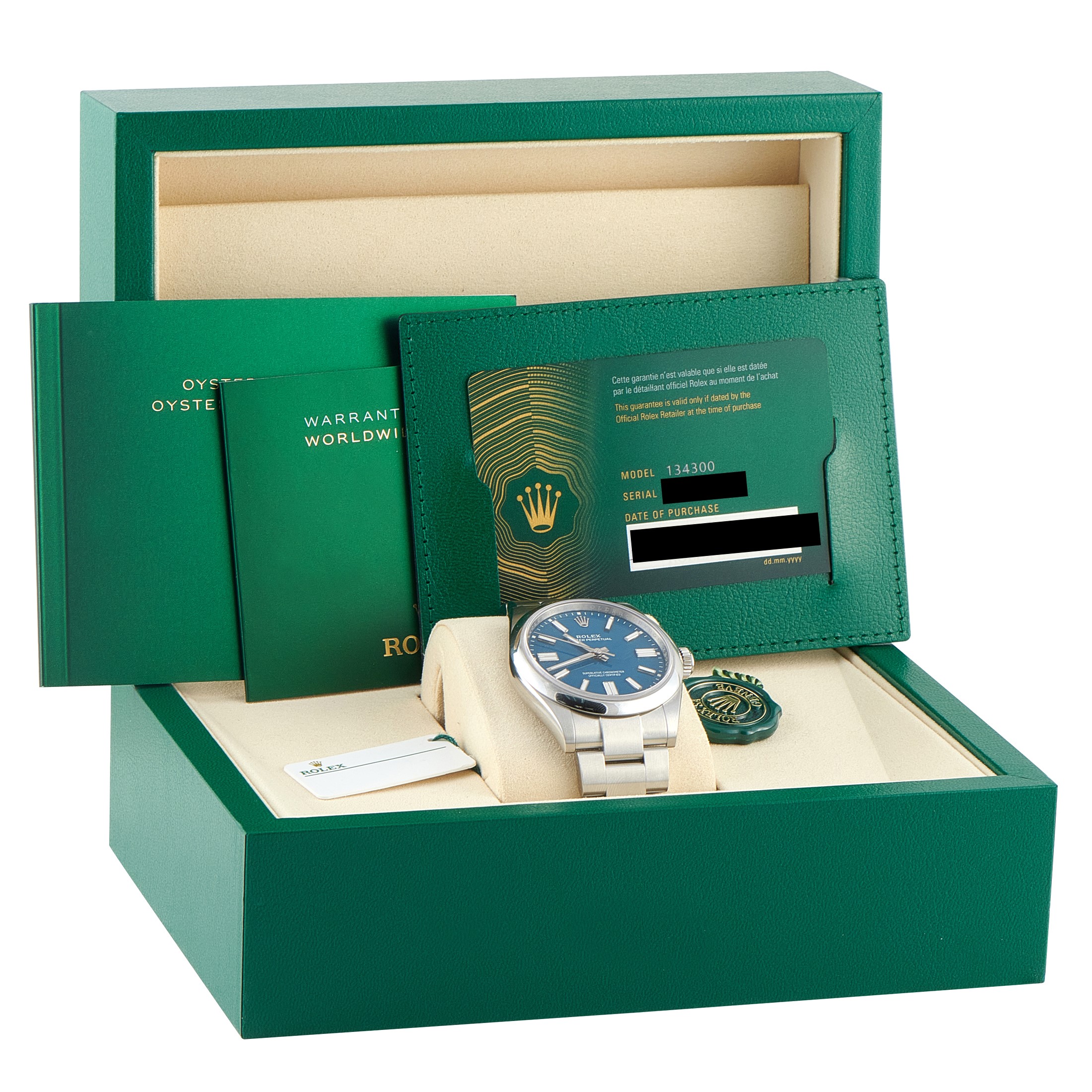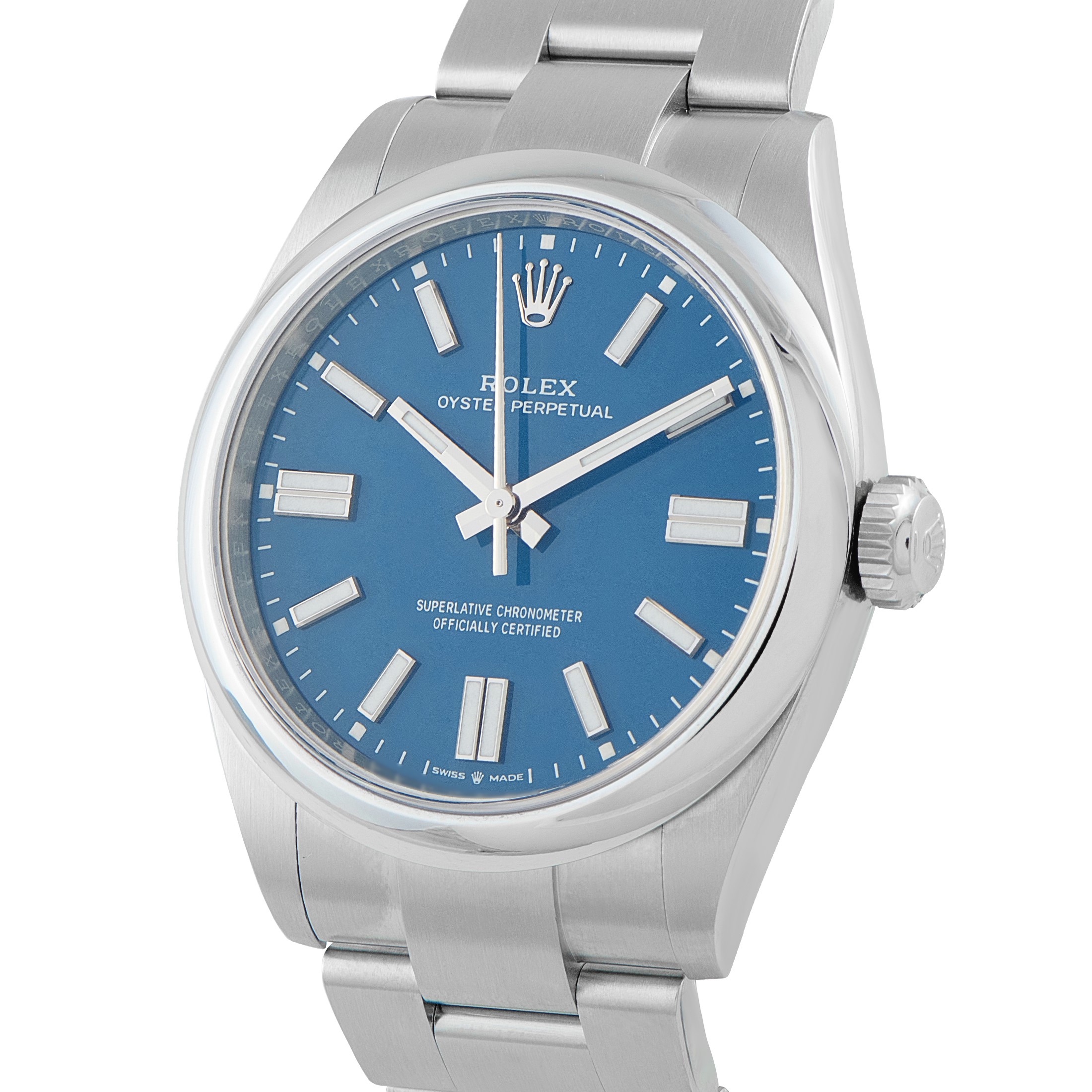 At 41mm, ref. 124300 is the largest Oyster Perpetual reference ever made. The OP41 debuted in late 2020 in a variety of popular colors. Its caliber 3230 movement gives it almost 3 days of power reserve, and its brushed Oyster bracelet makes it an everyday wearable piece. As a Superlative Chronometer, the OP41 is guaranteed to keep time within -2\/+2 seconds per day.<\/span>This pre-owned Rolex Oyster Perpetual 41 Med Blue Dial Oystersteel Watch 124300 comes with all requisite documentation and the original manufacturer's box.