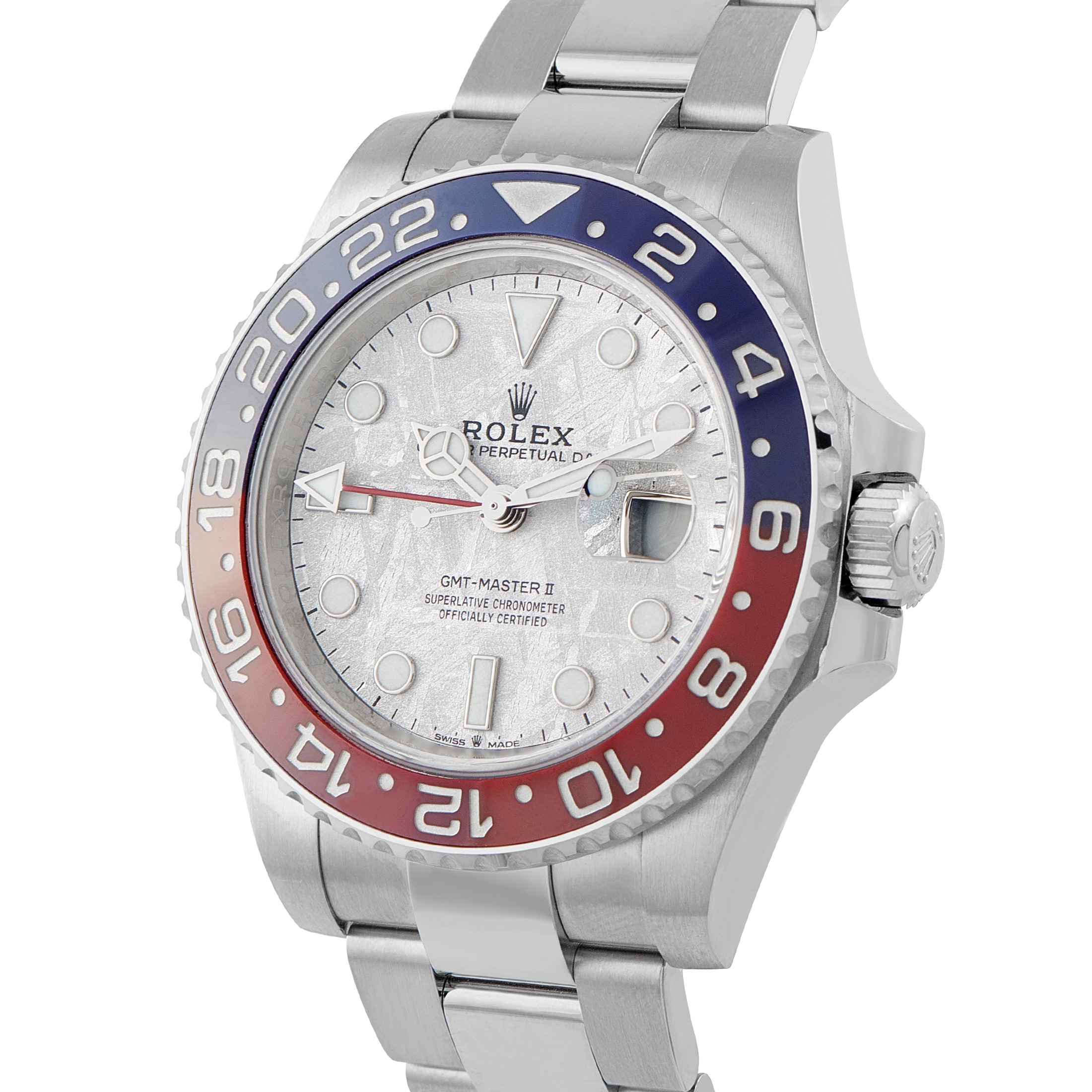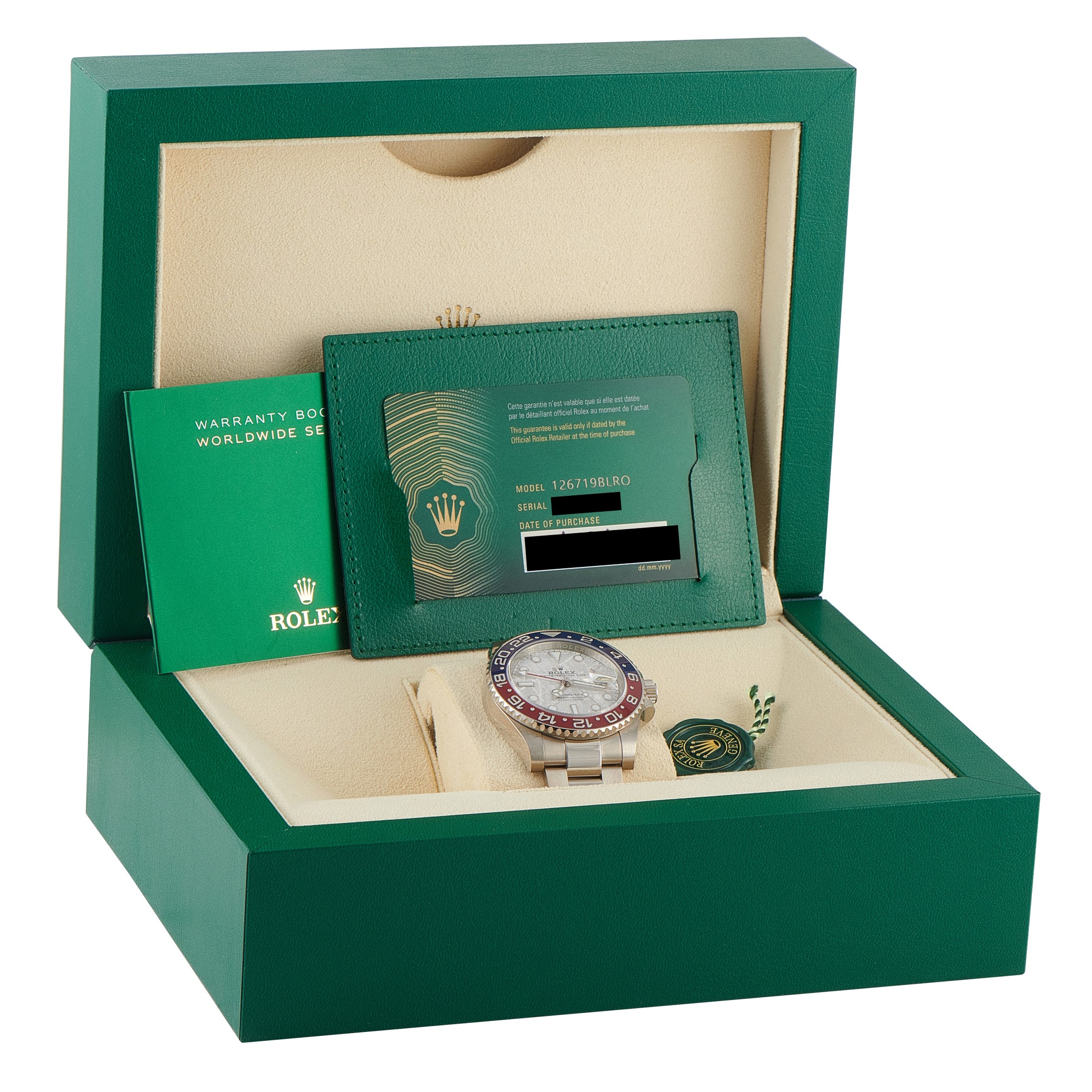 The Rolex ref. 126719BLRO is a GMT chosen for individuality, where material rarity matters as much as function. Its dial is cut from real Gibeon meteorite, showing natural interlocking crystalline lines that cannot be replicated or controlled. No two examples align. Set in solid white gold and framed by the red-blue Cerachrom bezel, the contrast is striking.Powered by the self-winding Caliber 3285, it offers independent hour adjustment, dual-time tracking, and a 70-hour power reserve.This unworn Rolex GMT-Master II Meteorite Dial 18K White Gold Watch 126719BLRO comes with papers and the manufacturer's box.
