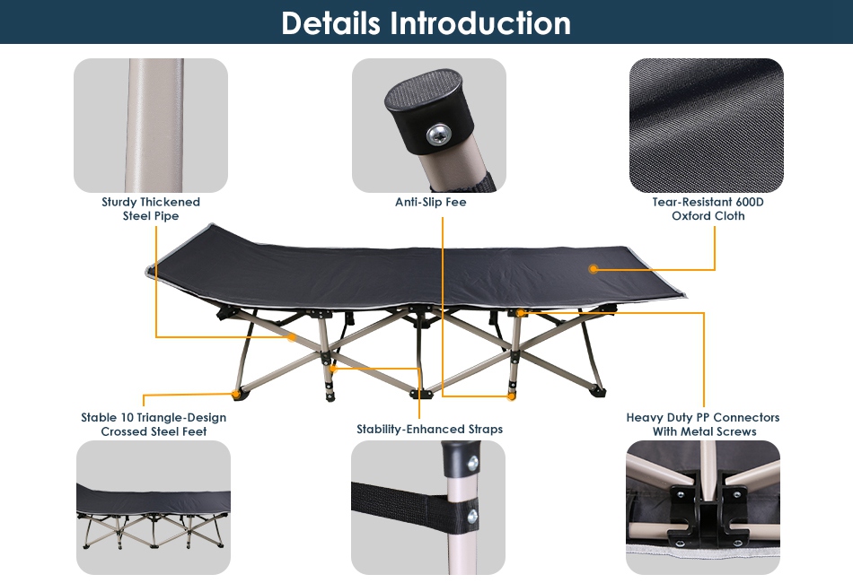 - High Load Bearing:Constructured with 10 triangle crossed steel feet with 2 stability-enhanced straps and made from tear-resistant 600D oxford cloth and sturdy PP plastic connectors and feet caps,the foldable bed cot has strong weight capacity up to 440lbs,great for most people with different figure and weight.