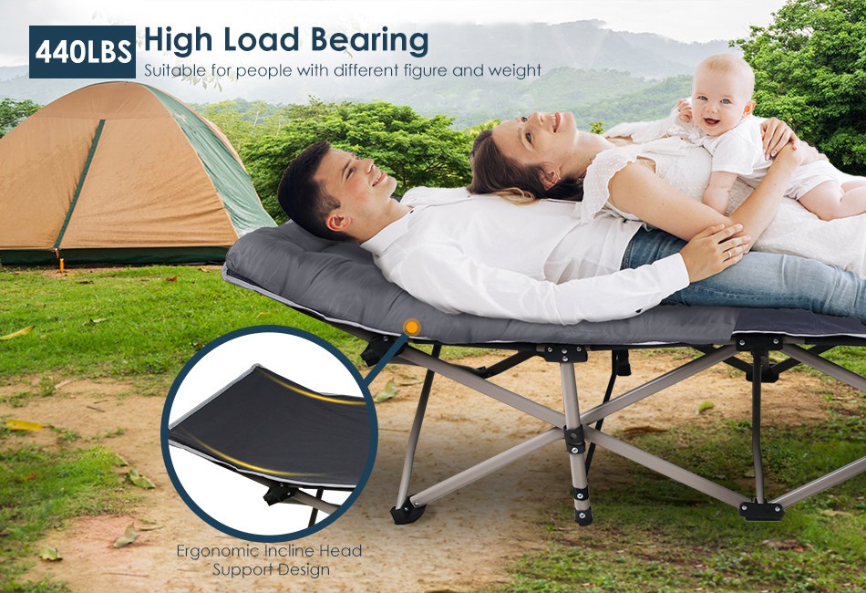 Our camping cot bed with soft pad is a great choice for anyone who is fond of outdoor adventure! Constructured with 10 triangle crossed steel feet with 2 stability-enhanced straps and made from tear-resistant 600D oxford cloth and sturdy PP plastic connectors and feet caps, it has strong weight capacity up to 440lbs, great for most people with different figure and weight. The incline head support and extra soft pad ensure max lying comfort! Simply install/fold it within seconds thanks to its tri-fold design. Easy to take it anywhere with a storage bag after fold it up into a compact size. Perfect for hiking, camping, fishing, hunting, traveling, etc., or just use in the office or as a perfect temporary bed when guests visit your home.