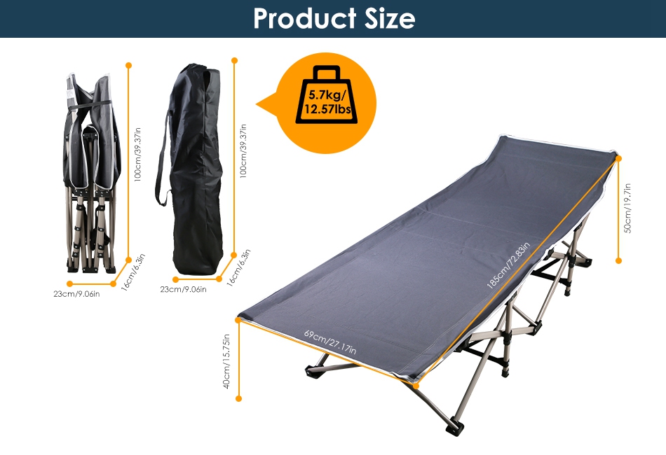 - Storage Bag Size & Weight(With Folded Bed Cot): 23x16x100cm/9.06x6.3x39.37in; 5.7kg/12.57lbs