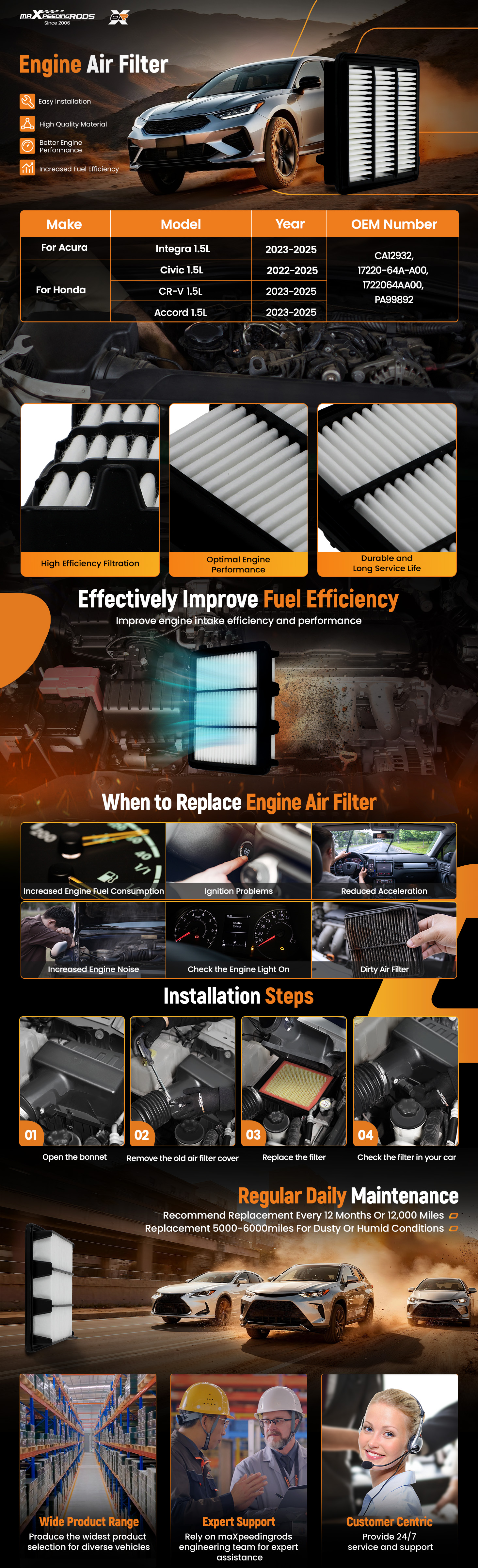 Enhanced Performance: Engine Air Filter uses fine filtration media to capture all kinds of debris without obstructing airflow, removing dangerous particles, improving engine performance and increasing engine efficiency.