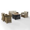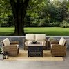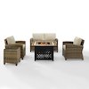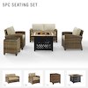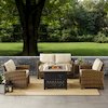 Relax by the warmth of the fire with the Bradenton 5Pc Patio Conversation Set. The outdoor loveseat, patio chairs, and side table are made from all-weather resin wicker, while the seats have cushions covered in solution-dyed polyester. The outdoor seating surrounds a propane fire pit table constructed from sturdy powder-coated steel. The fire table's slatted top and solid paneled base offer a simple design that blends with a variety of outdoor spaces. The gas controls and a rack for a propane tank are located inside the table's base, keeping them close at hand but out of sight. You'll be ready to relax in comfort with the Bradenton patio set.