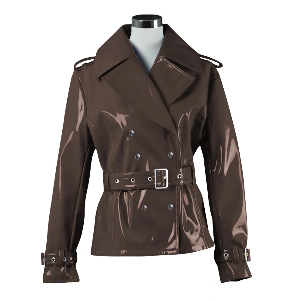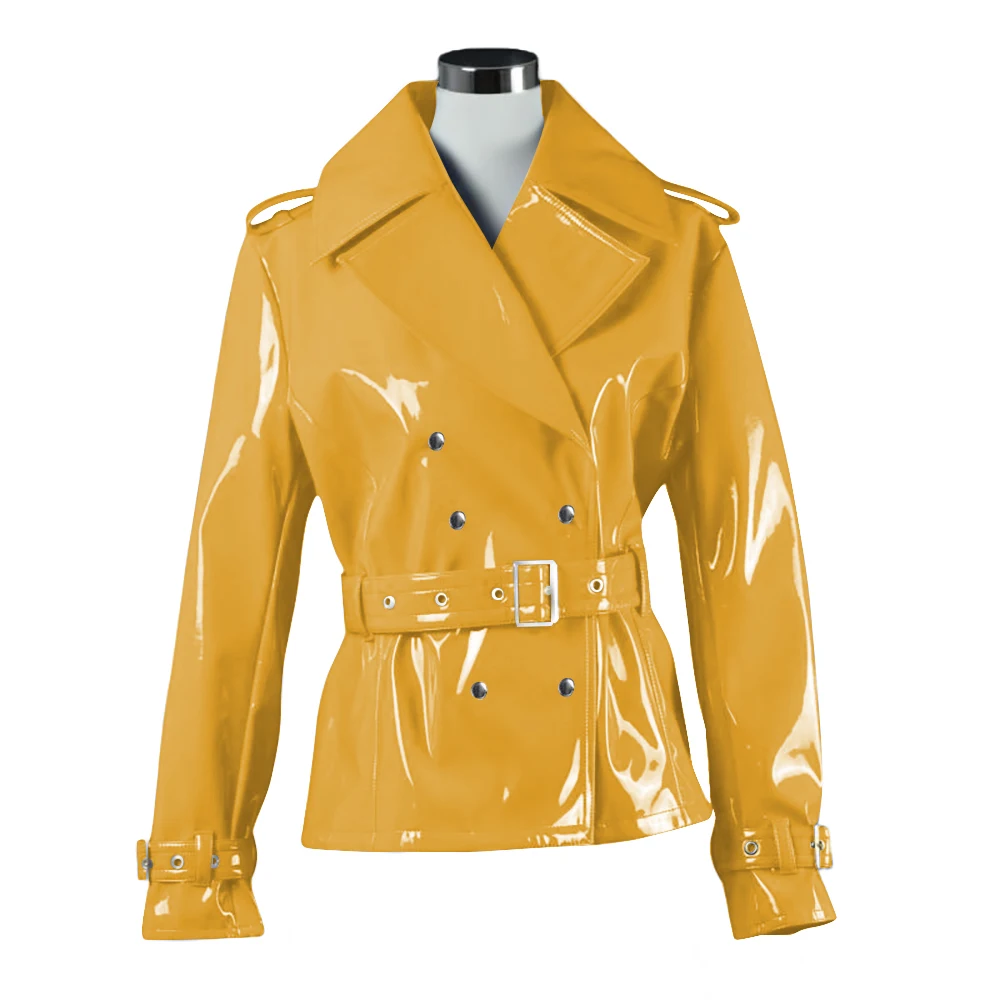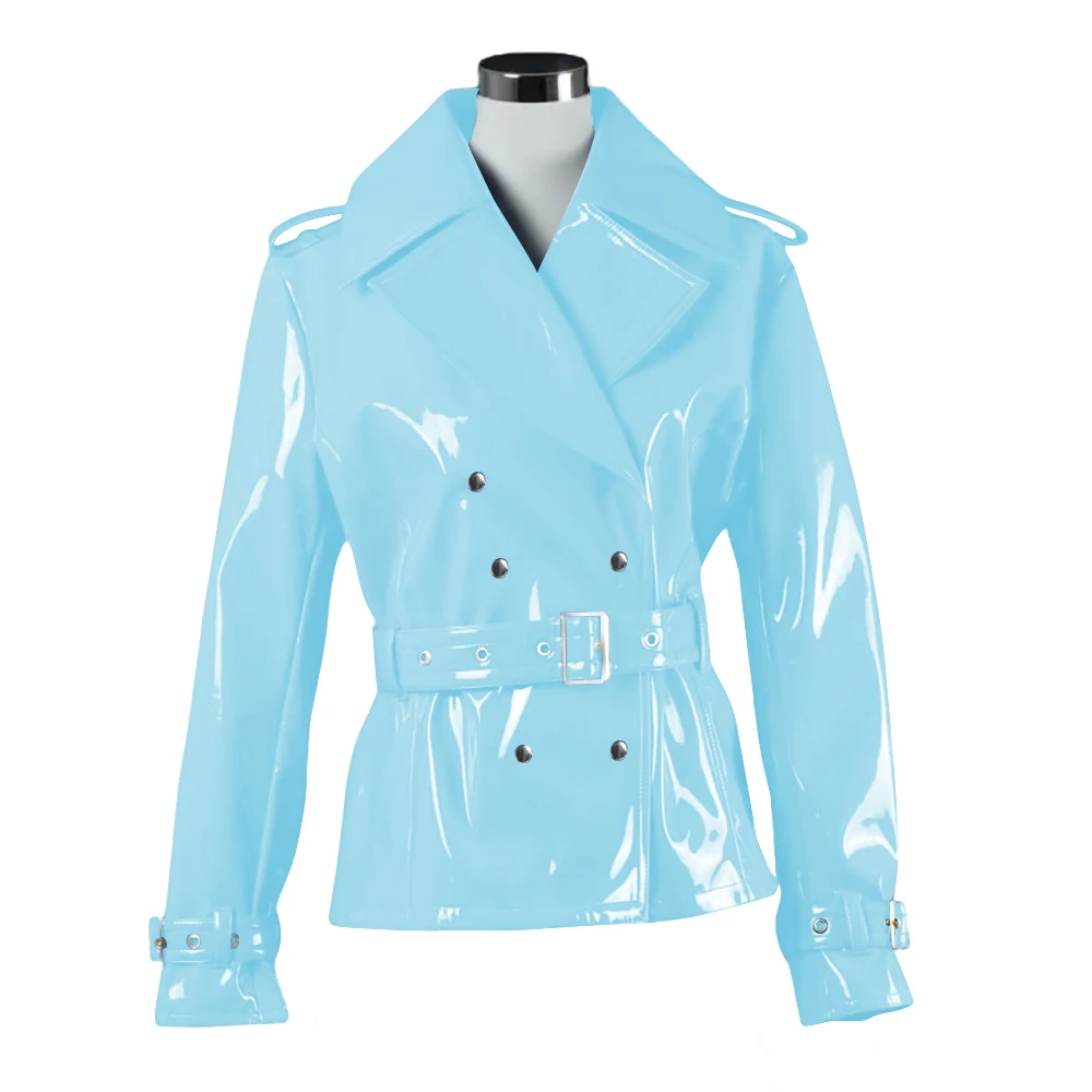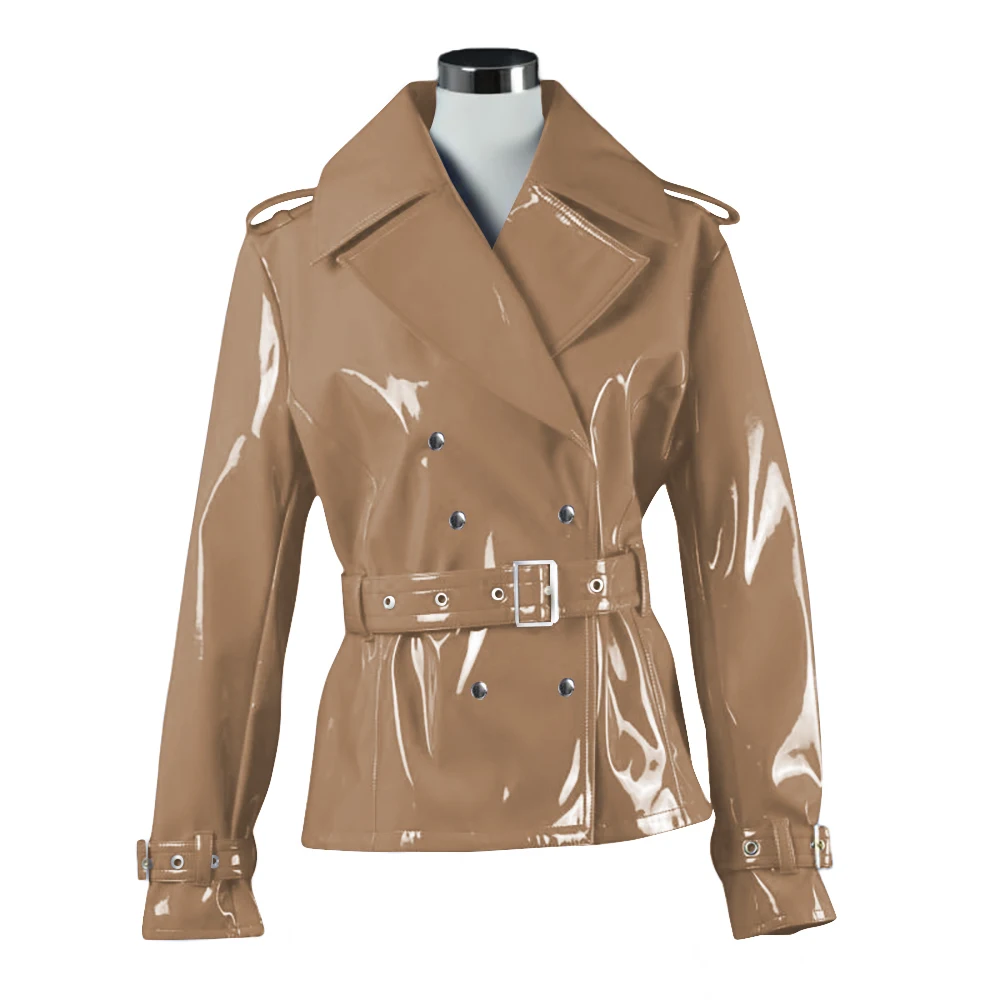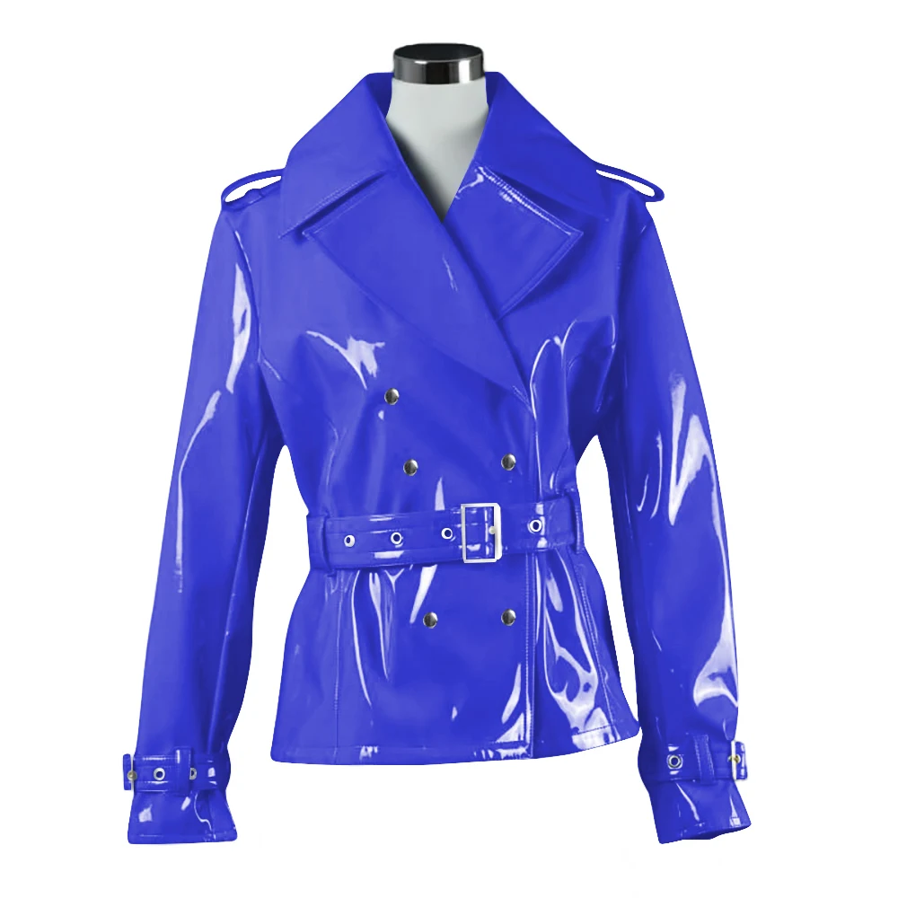 This **fashion jacket** is a statement piece that effortlessly transitions from day to night. Its **unisex outerwear** appeal ensures it complements any wardrobe, while the **shiny PVC leather** material offers a bold, eye-catching finish. Whether you're layering it over a dress or pairing it with jeans, this **belted jacket** guarantees a polished, fashion-forward look.