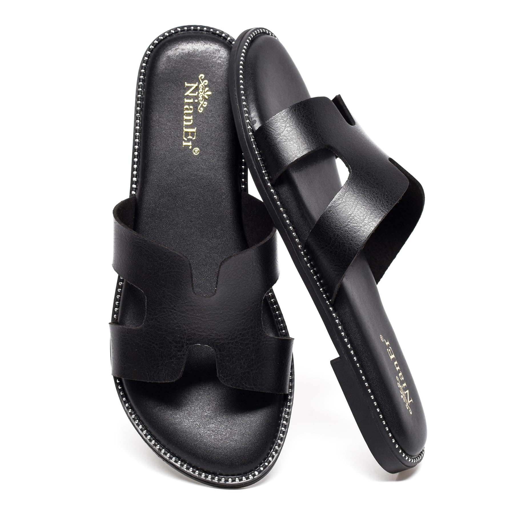 NianEr Womens Microfiber Leather Memory Foam Support H Sandals Dress Dressy Slip On Casual Cute Comfort Bride Bridal Wedding Designer Date Flat Sandals Summer Shoes Slides Black Size 8