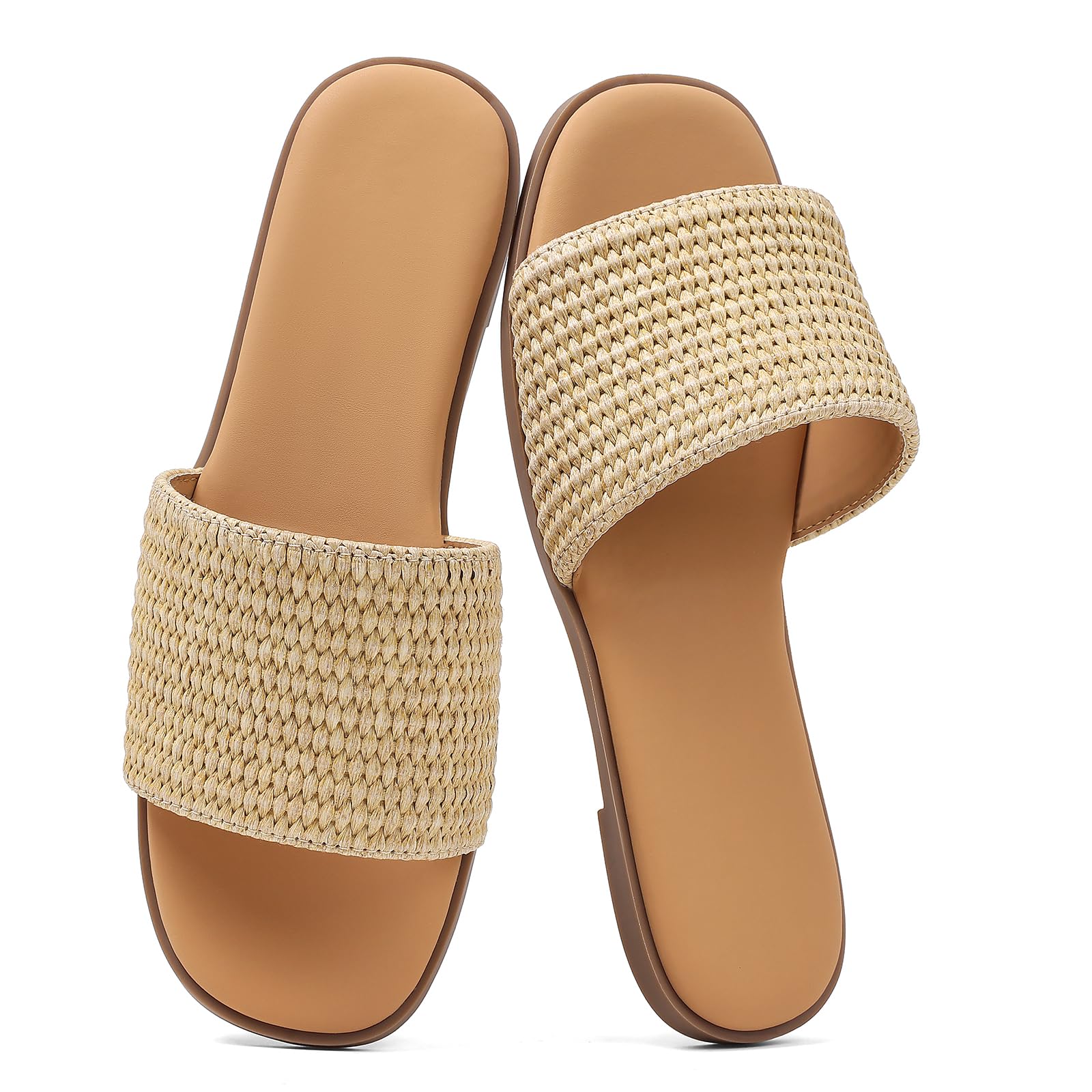 Tscoyuki Slides Sandals for Women Basic Raffia Slip On Flat Sandals Open Toe Comfort Beach Sandals Slippers for Casual Dressy Summer Tan Size 8