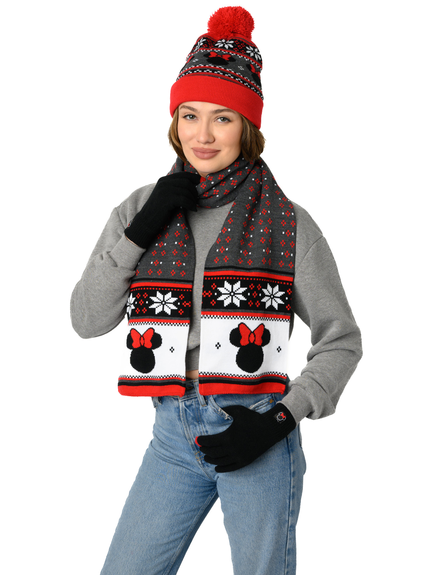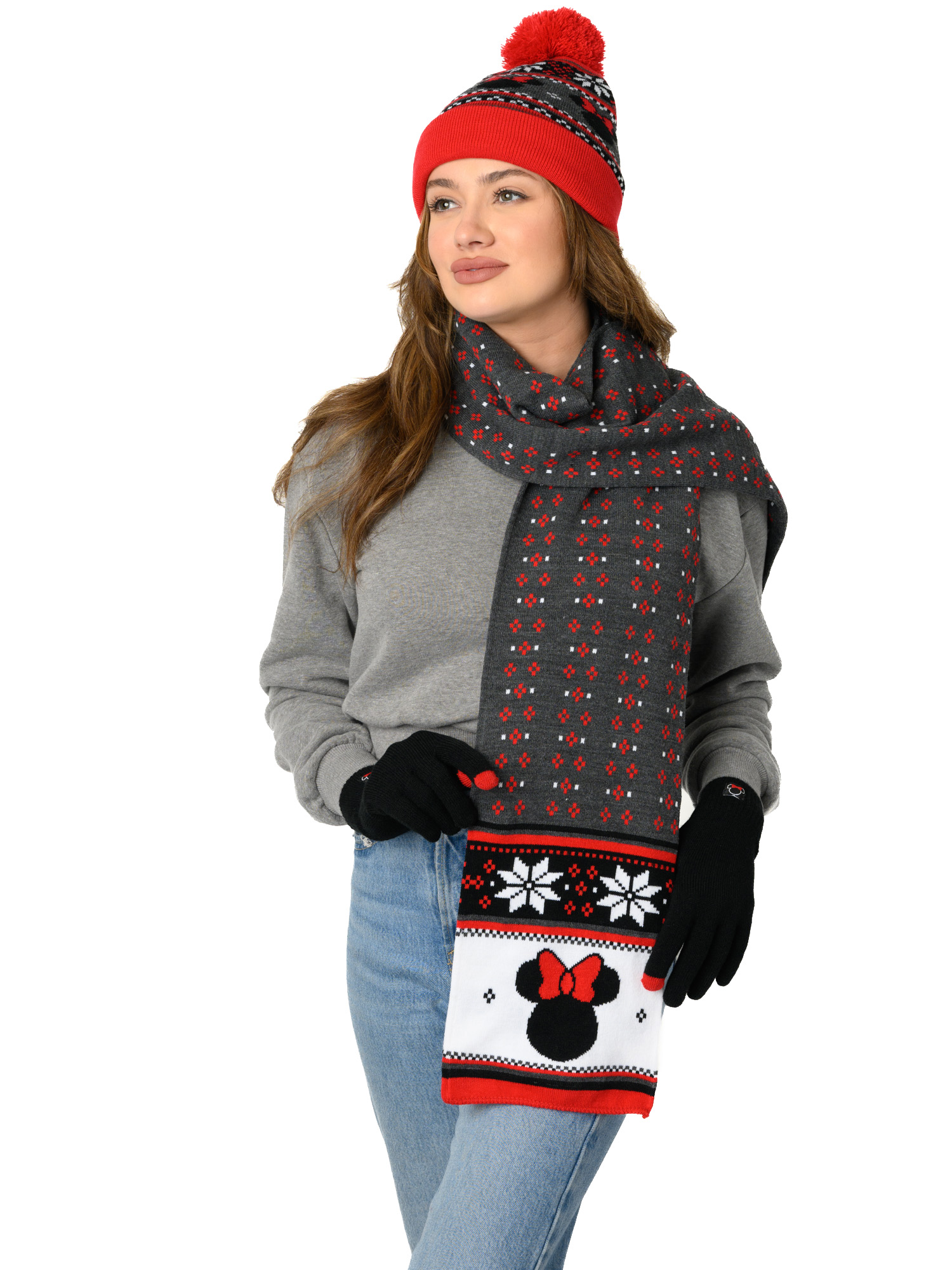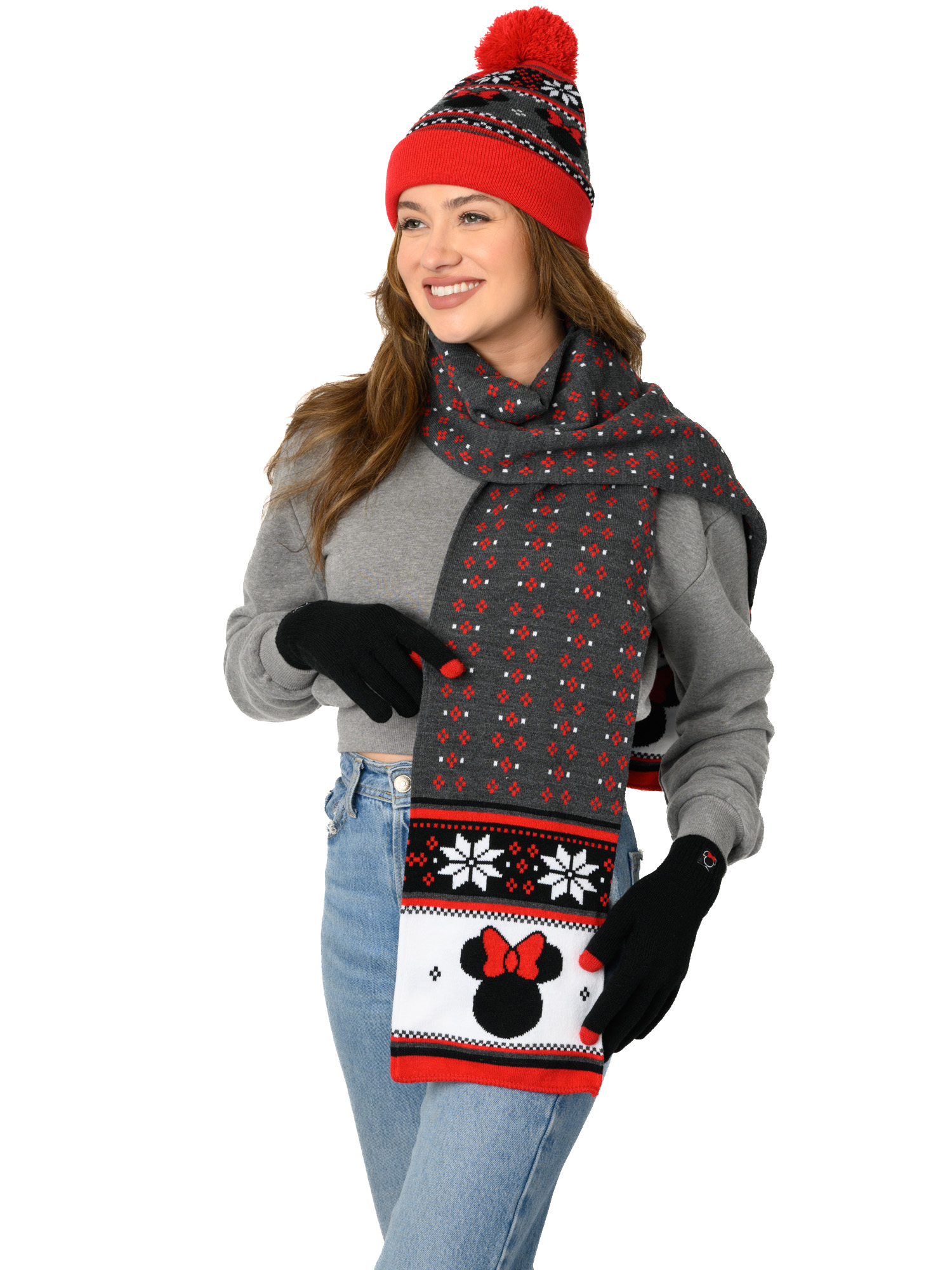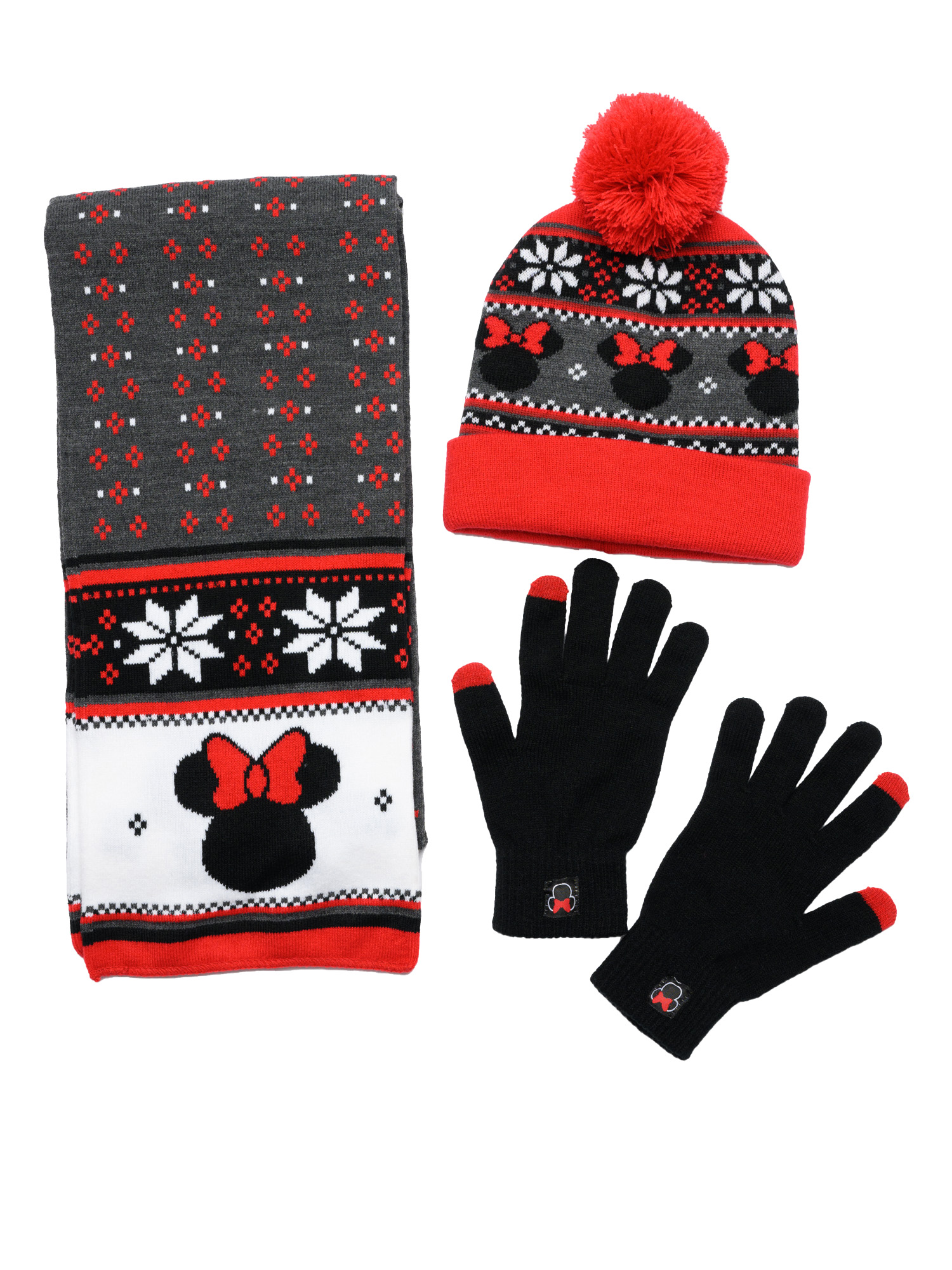- Set Includes: (1) Minnie Mouse Beanie Hat with Gloves Touch Screen Disney Women's Knit Red Set & (1) Minnie Mouse 70" Knit Scarf Disney Women's Red Winter Set