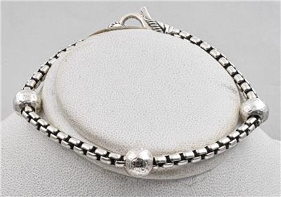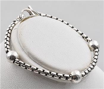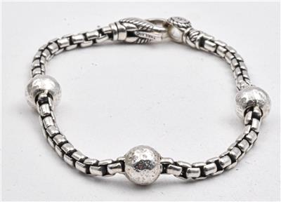 This is an authentic signed braelet, from Jai, and made by John Hardy, and guaranteed. It is called, a station bracelet, with 3 - 8mm diameter hammered balls, along the length of the bracelet. It is 7.25" in wearble length, and in new like condition. Not a speck of wear or damage, and was probably not worn much, if at all. This is even still shiny, and really doesn't need anything.