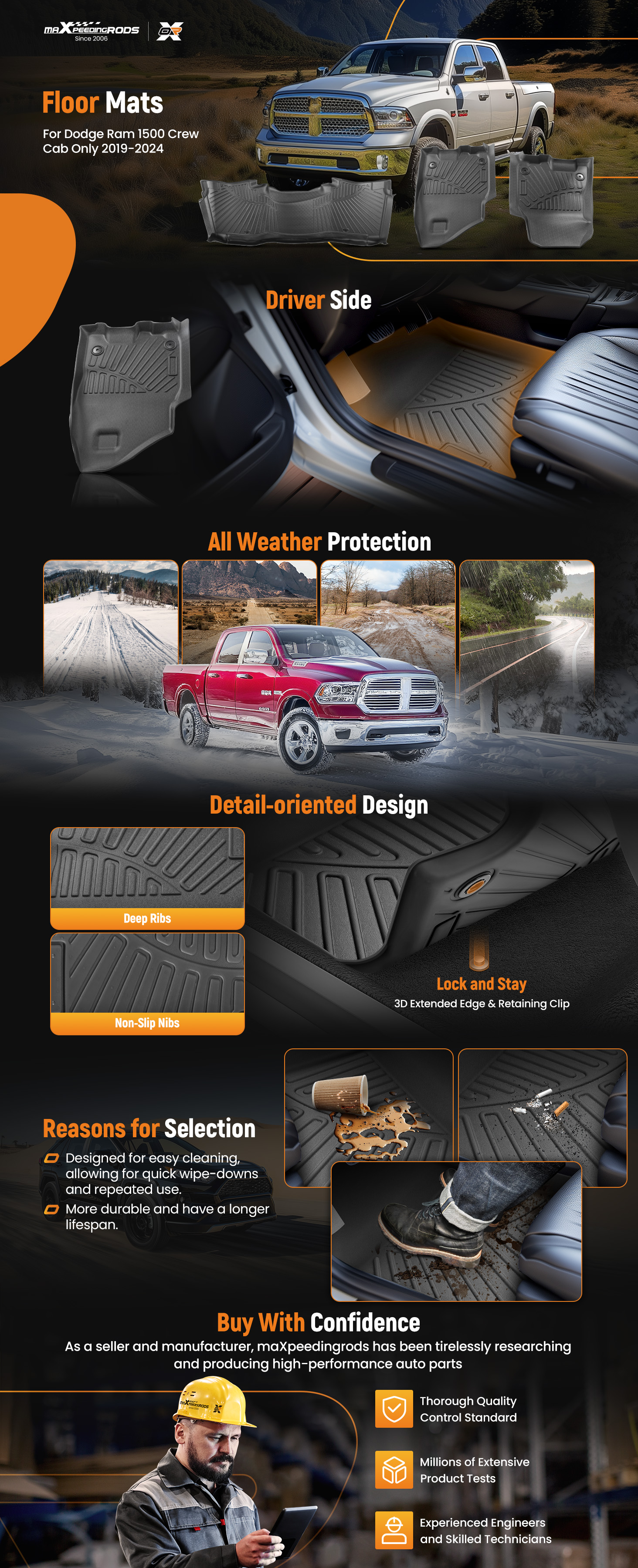 - All-weather protection, Unique designed channels and raised edges can effectively trap the liquid, snow, sand, etc.