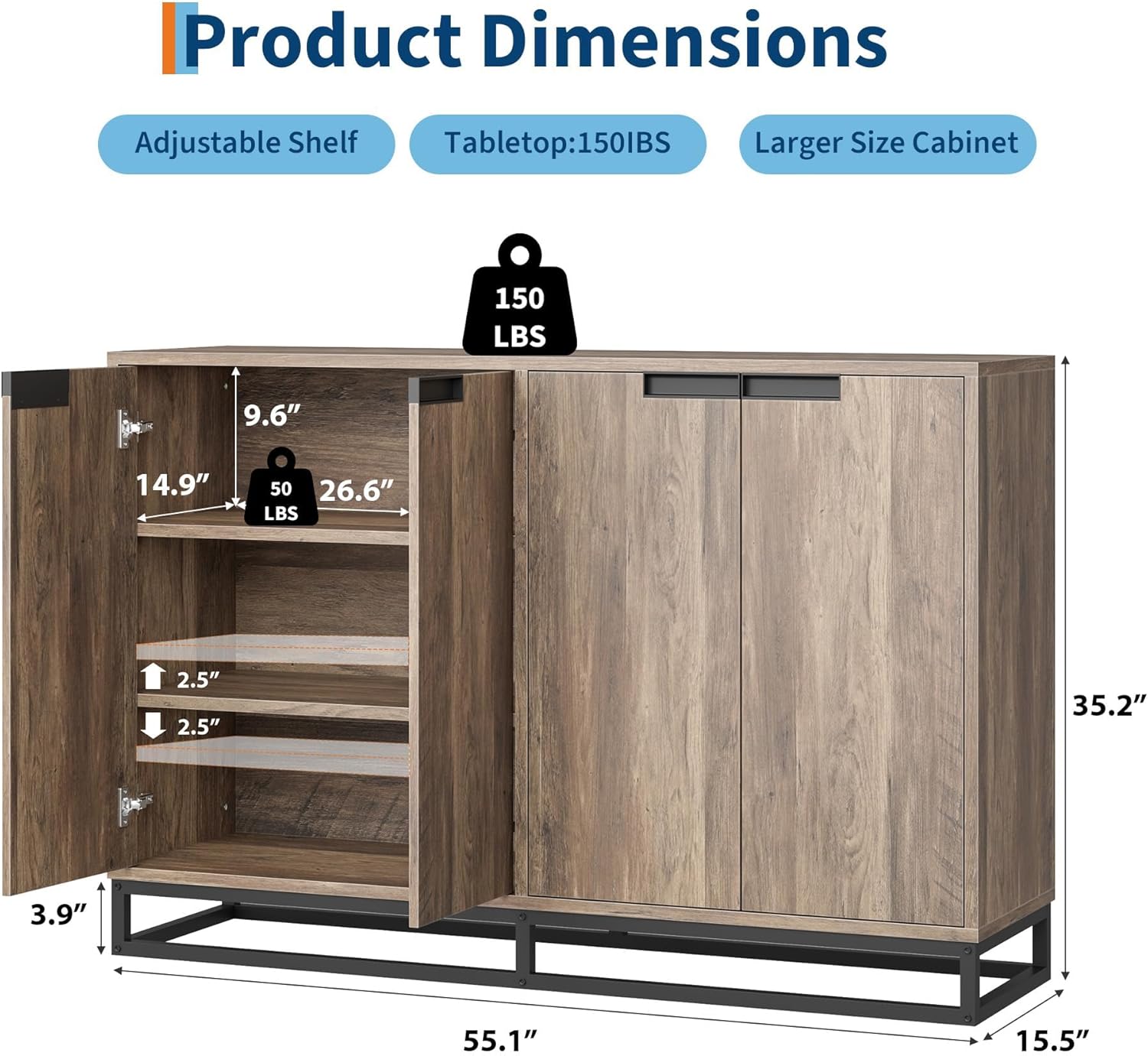 Overall Dimensions: 15.5” D × 55” W × 35.2” H; Total Weight Capacity: 150 lbs; Each Internal Shelf: 50 lbs.