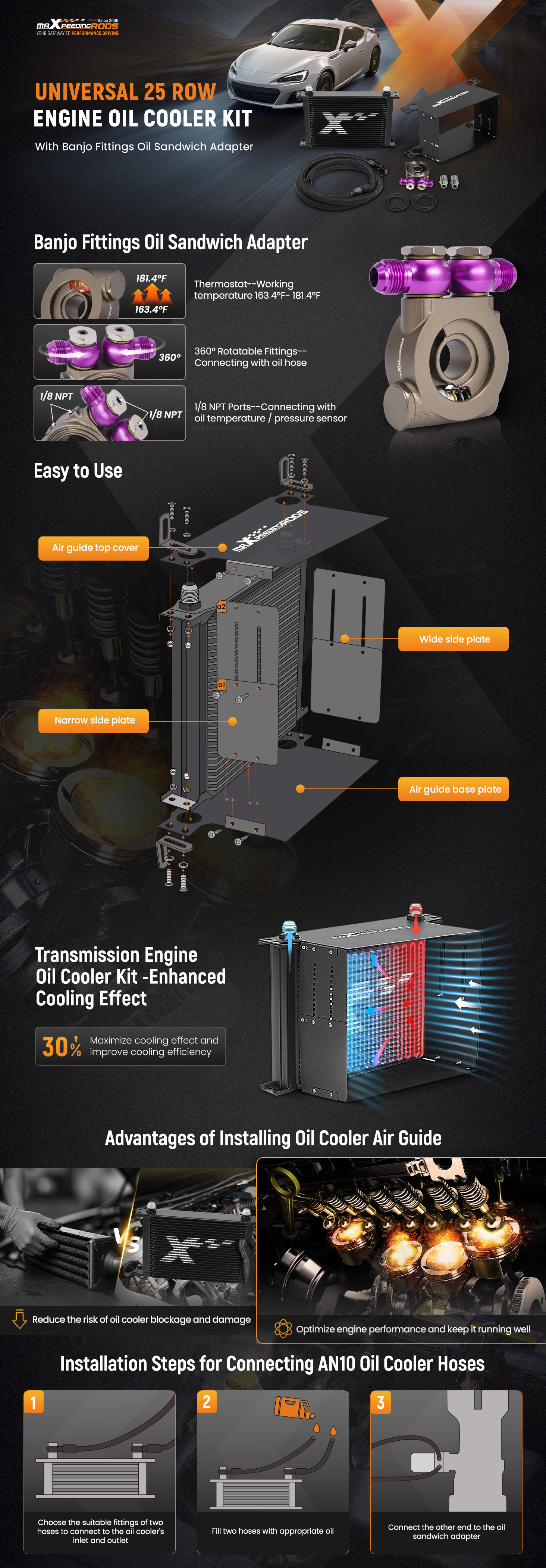 2. This is a universal oil cooler kit. Just measure the size of the space before buying to ensure that it can be installed, and then you can choose the right size according to your cooling efficiency needs.