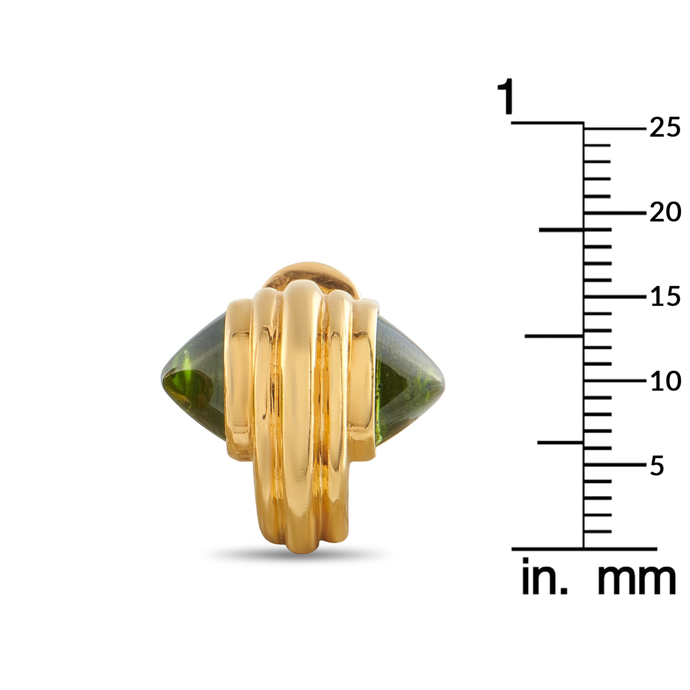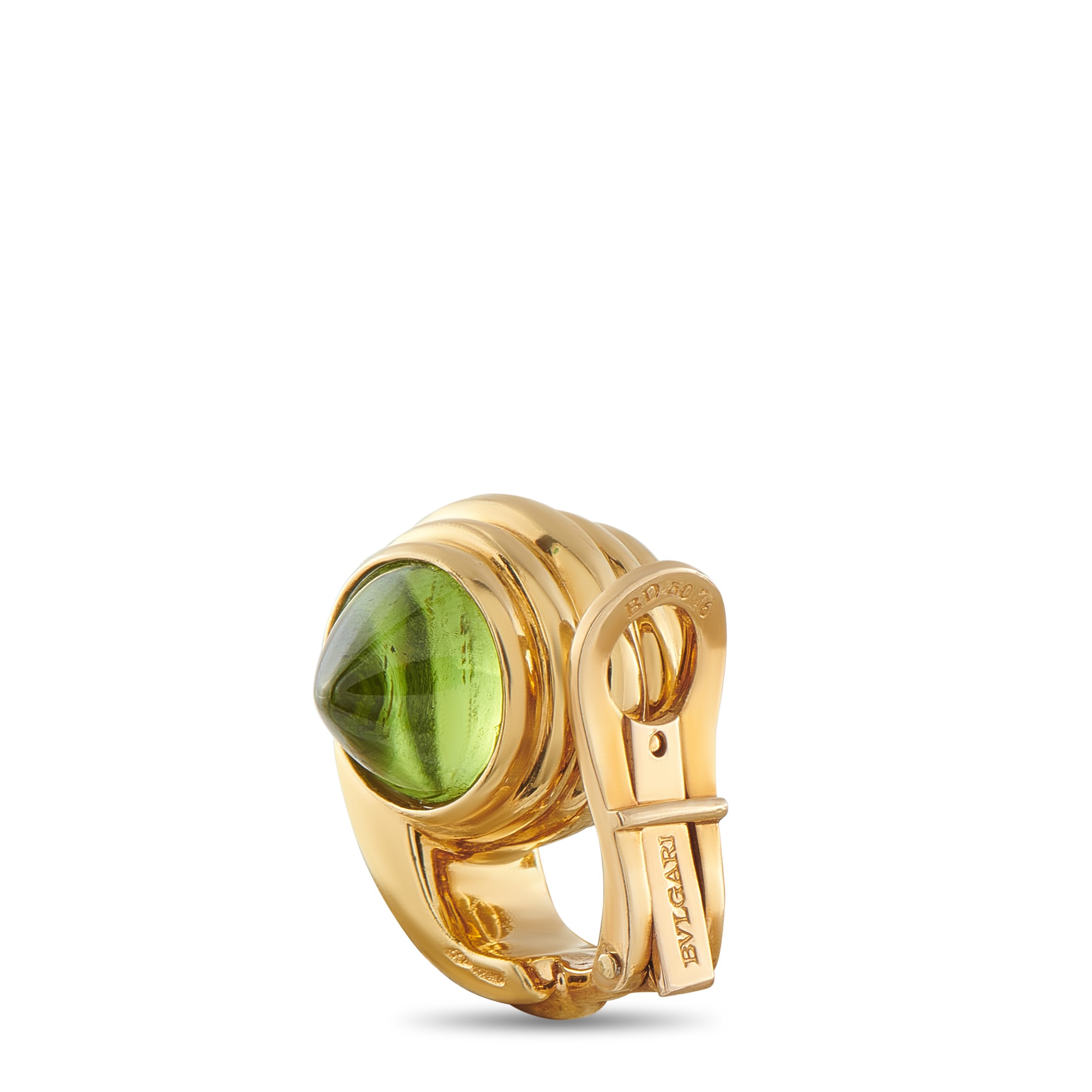 These breathtaking Bvlgari earrings are meant to make a statement. The bold 18K Yellow Gold settings come complete with conical Peridot stones at each end of the design. Each earring measures 0.63 long by 0.69 wide and includes clip-on closure.This jewelry piece is offered in estate condition and includes a gift box.