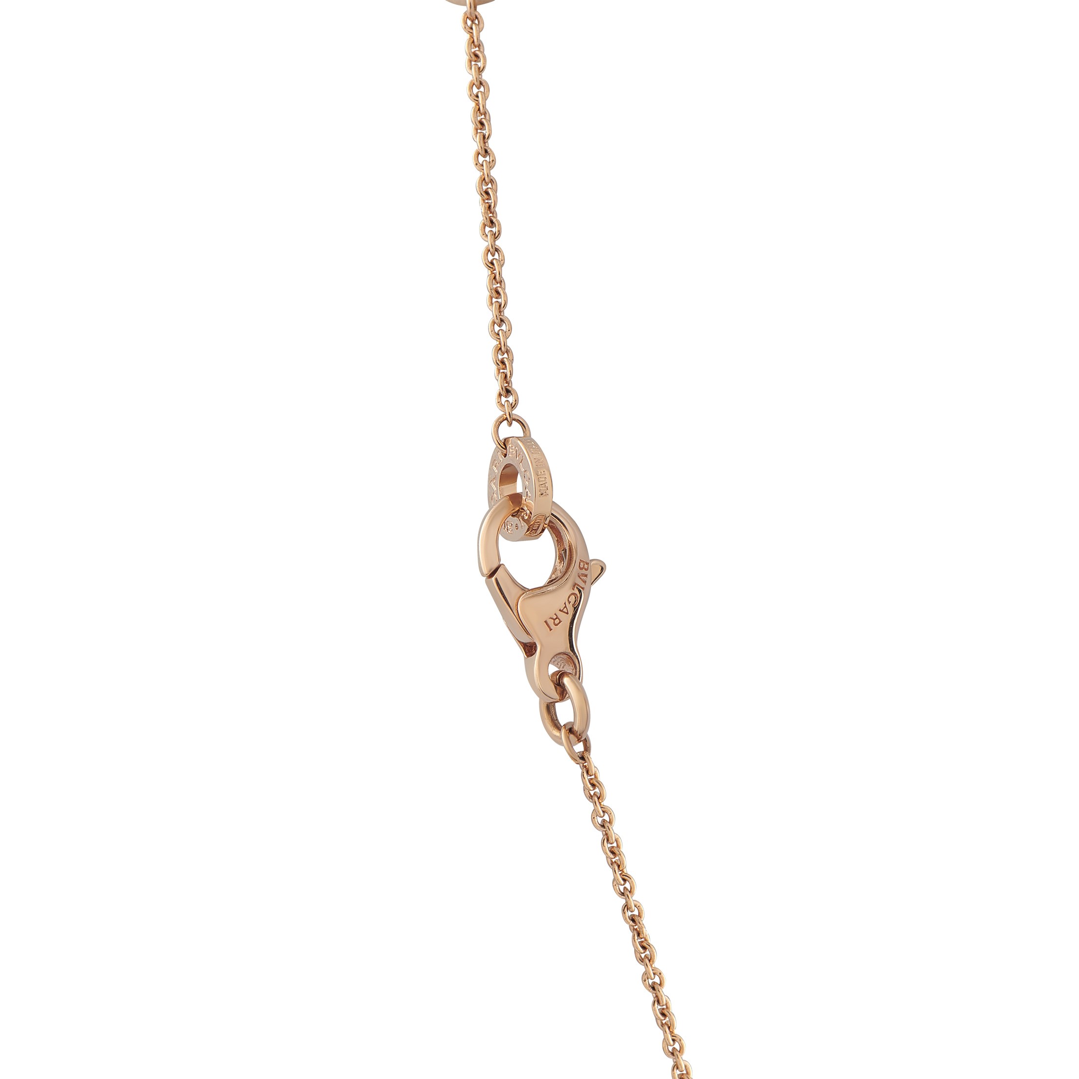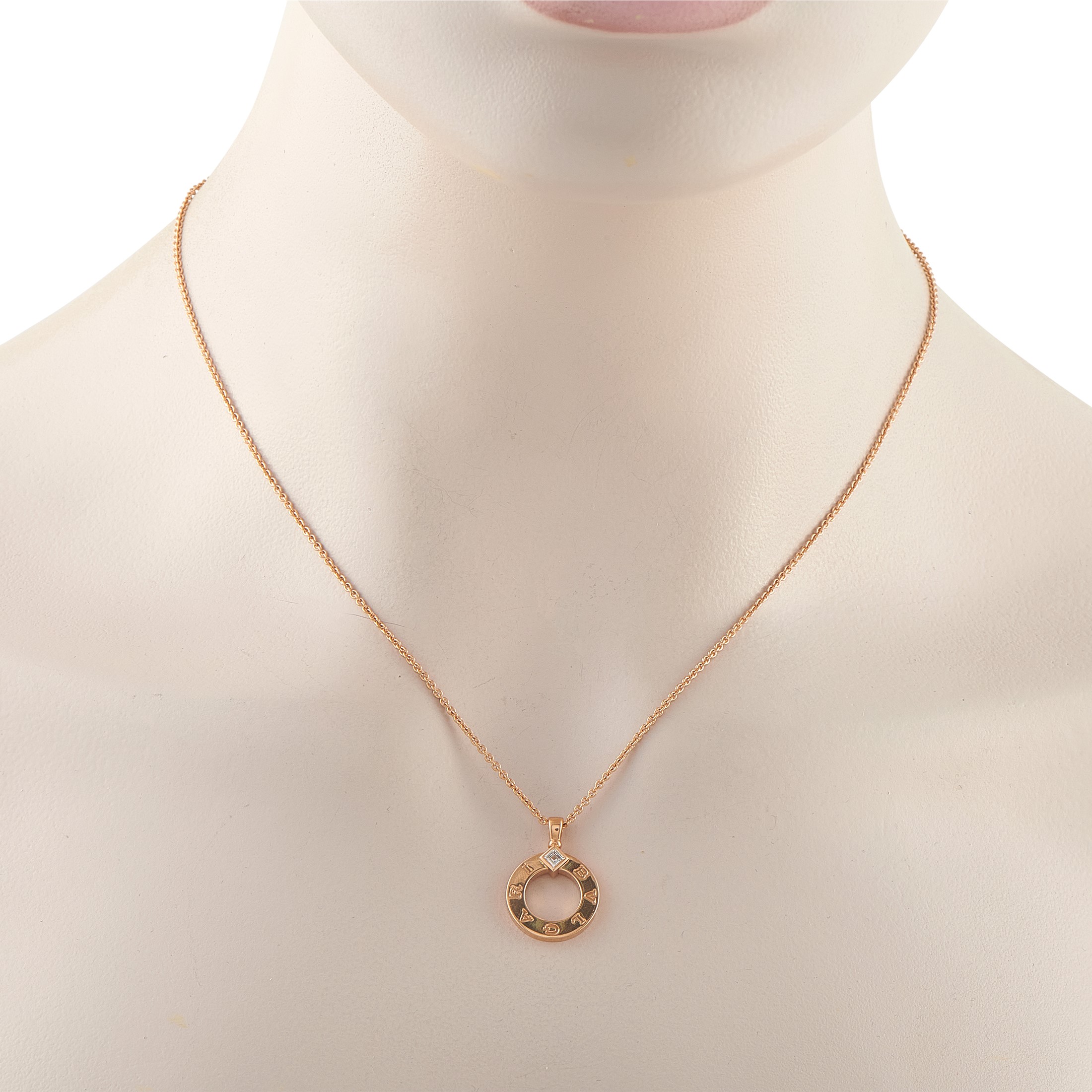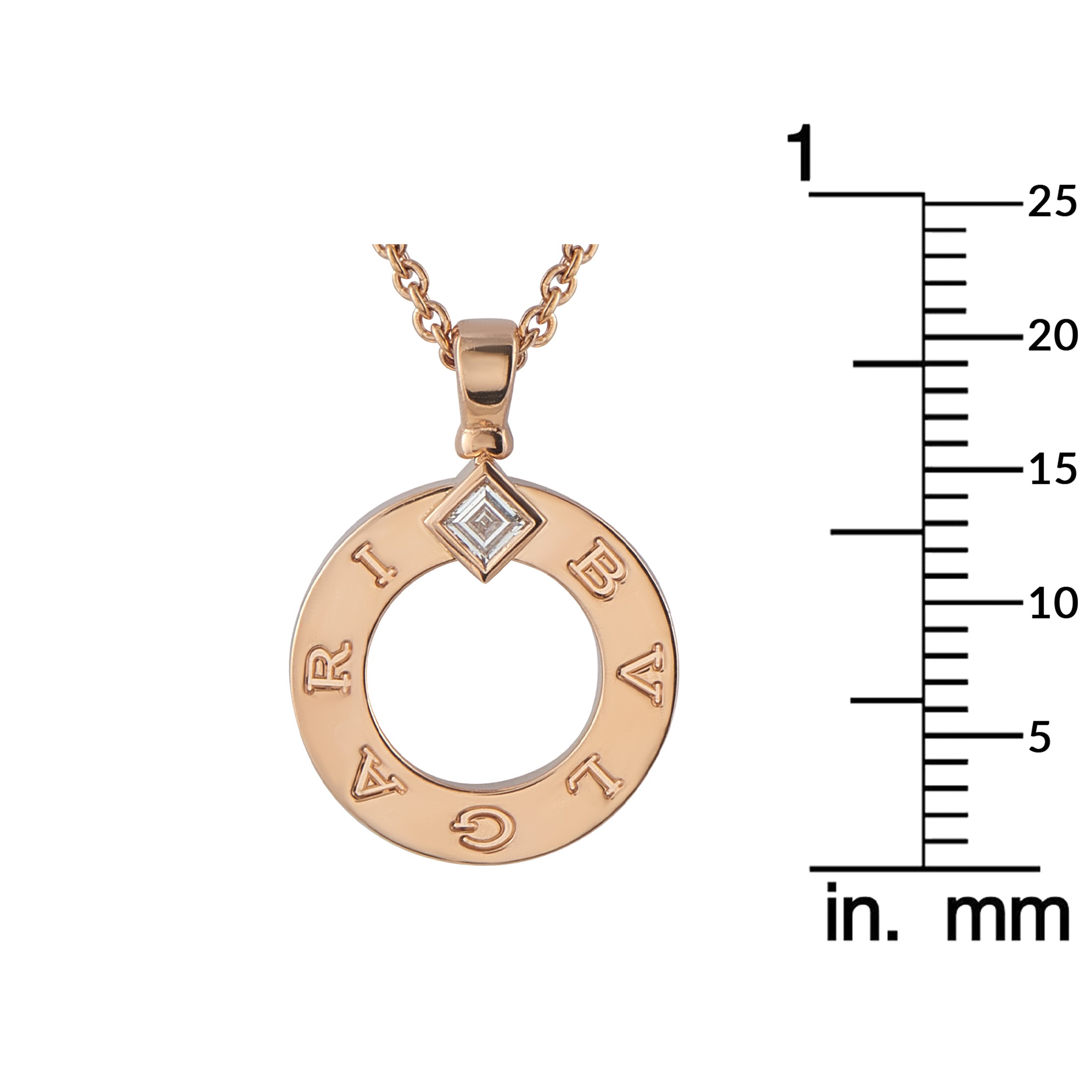 On this Bvlgari Bvlgari necklace, the collection's trademark logo evokes the curved inscriptions found on ancient Roman coins. A piece that beautifully blends the past and present, a single carr Diamond provides the perfect finishing touch. Set in 18K Rose Gold, the pendant measures 0.82 long by 0.63 wide and is suspended from an 18 chain.This jewelry piece is offered in estate condition and includes a gift box & papers.