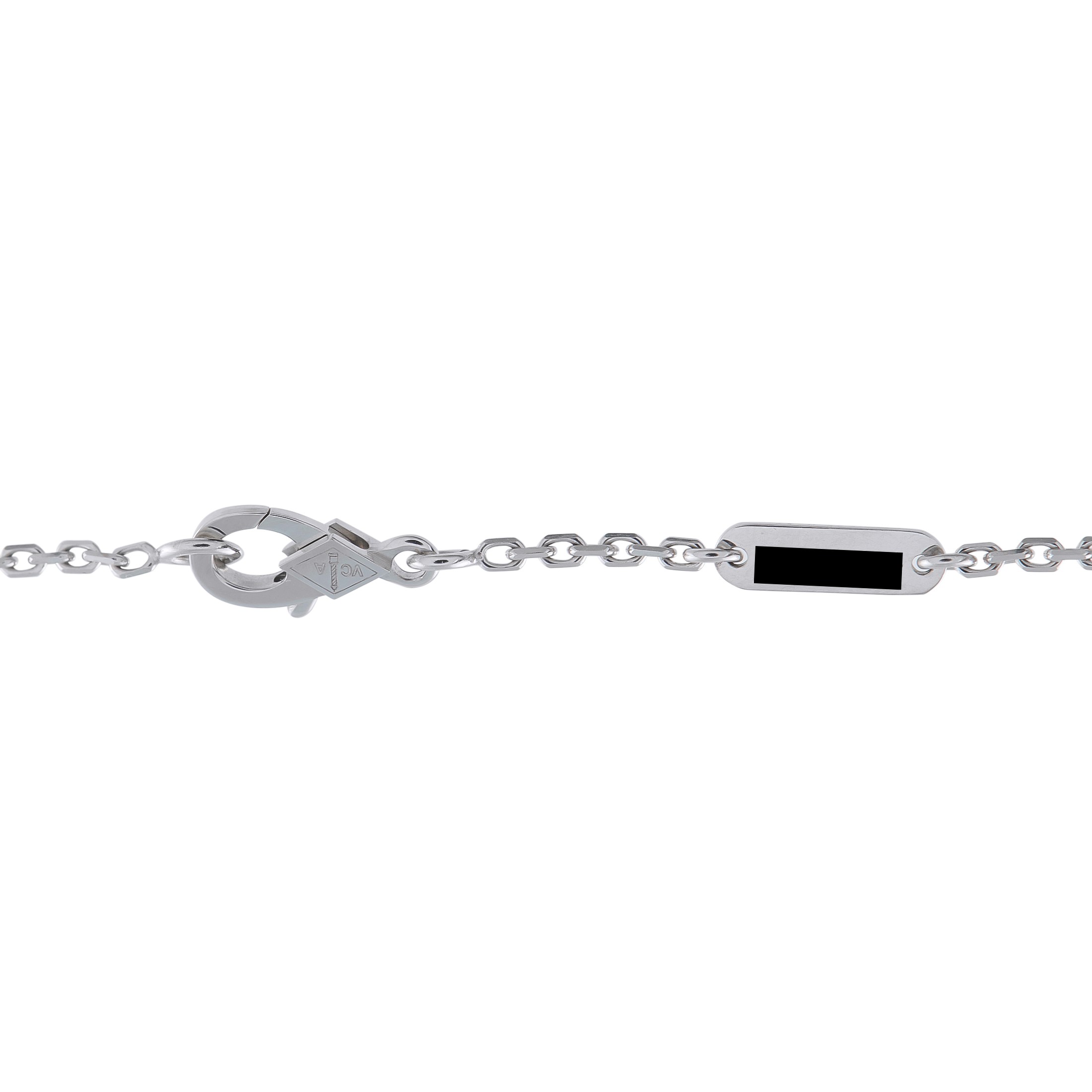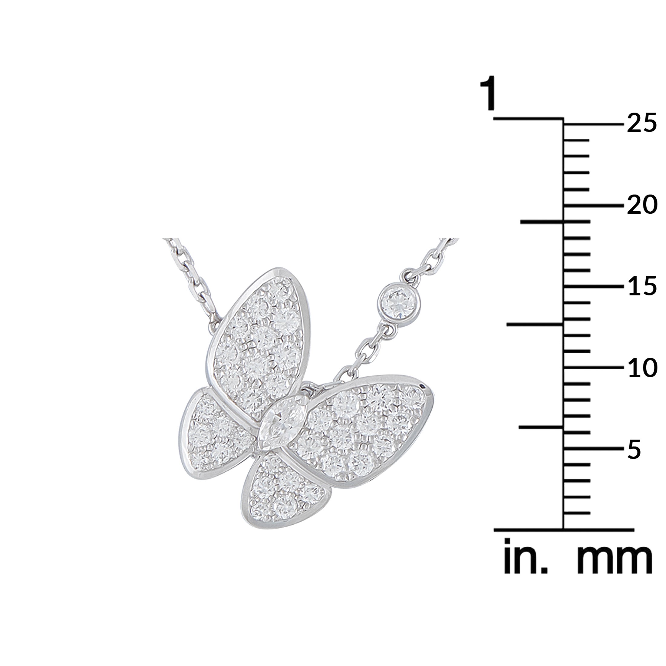 An elegant, airy design makes this Van Cleef & Arpels Two Butterfly necklace instantly captivating. Covered in Diamonds totaling 0.88 carats, this exquisite accessory features an asymmetrical design that is meant to capture the appearance of butterflies in flight. Set in 18K White Gold, the pendant measures 0.63 round and is suspended from a 15.50 chain.This jewelry piece is offered in estate condition and includes a gift box.