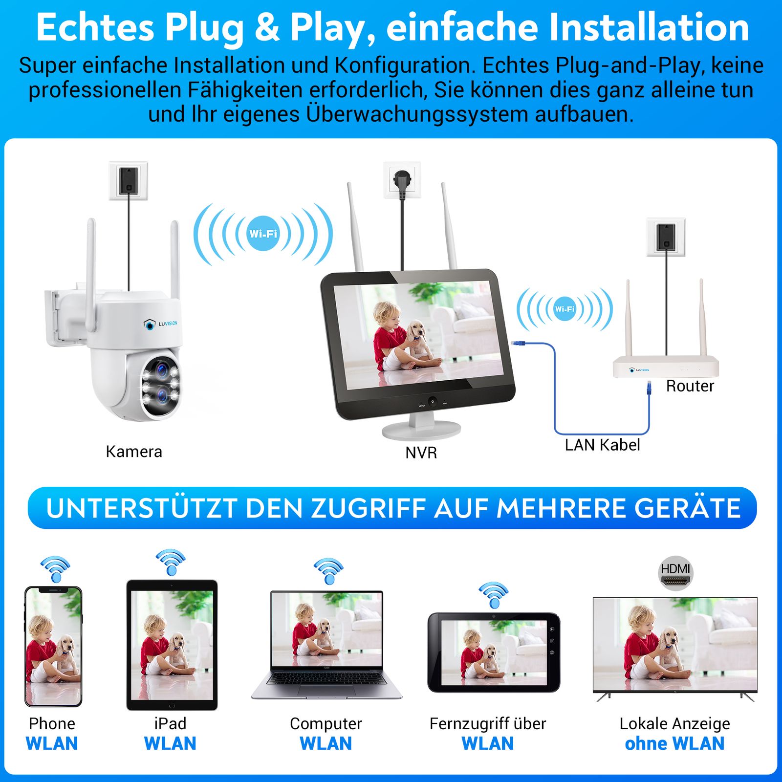 - Drahtlose Verbindung zwischen Monitor/NVR und 3MP x 3MP Kameras per WLAN