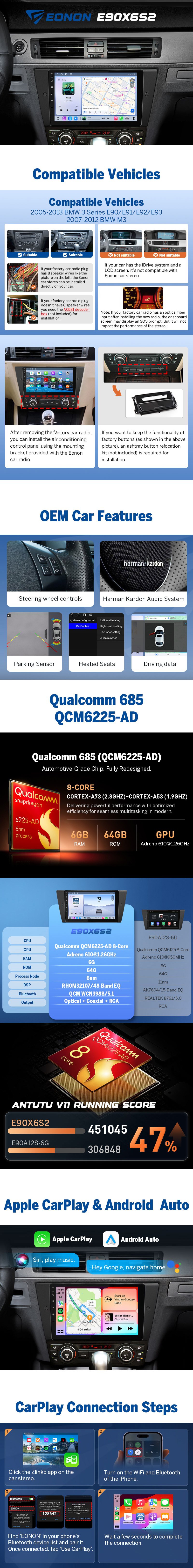 🔥 Eonon E90X6S2 Premium Android Car Stereo For BMW 3 Series E90 / E91 / E92 / E93 (2005–2013) | Plug & Play Factory-Fit Upgrade 9" QLED HD Touchscreen | Wireless Apple CarPlay & Android Auto | 6GB RAM + 64GB ROM | Built-in 4G LTE | ROHM DSP Audio | WiFi 6 | GPS Navigation | OTA Updates
