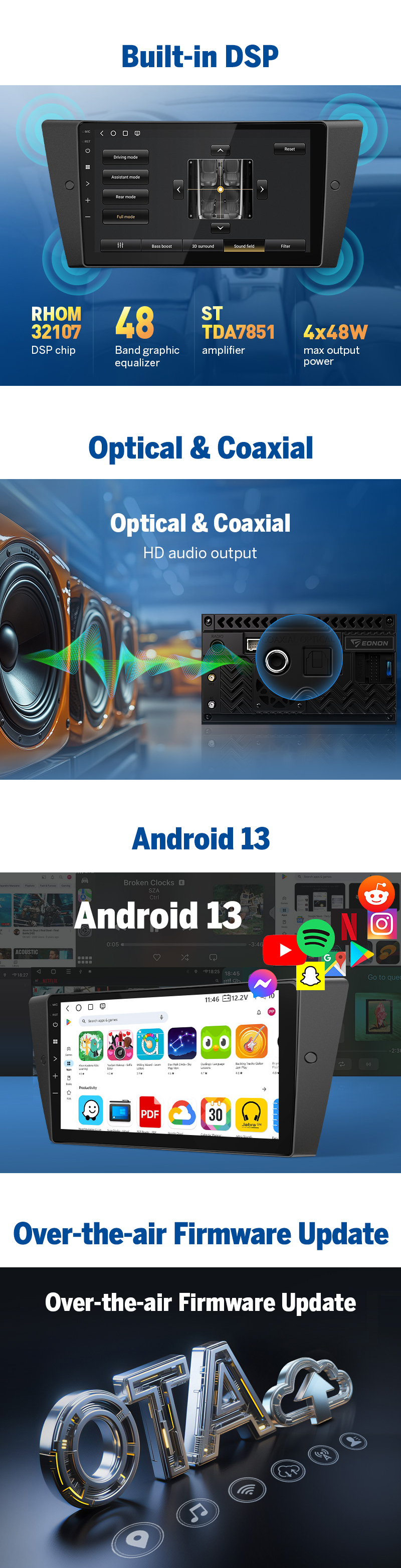 🔊 Audiophile-Grade ROHM DSP Sound A serious sound upgrade for drivers who care about clarity, power, and tuning control. Powered by ROHM DSP and ST TDA7851 Class-AB amplifier: