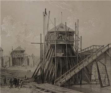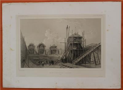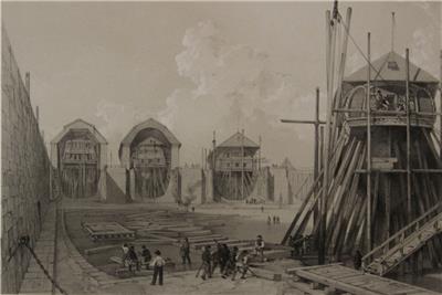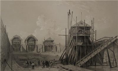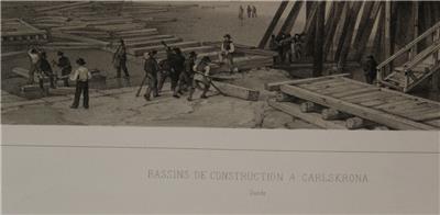 Description: Striking and highly detailed original lithographic view depicting the dry docks (called "Femfingerdockorna" or "the five fingers") at the Karlskrona Naval Arsenal, Sweden.