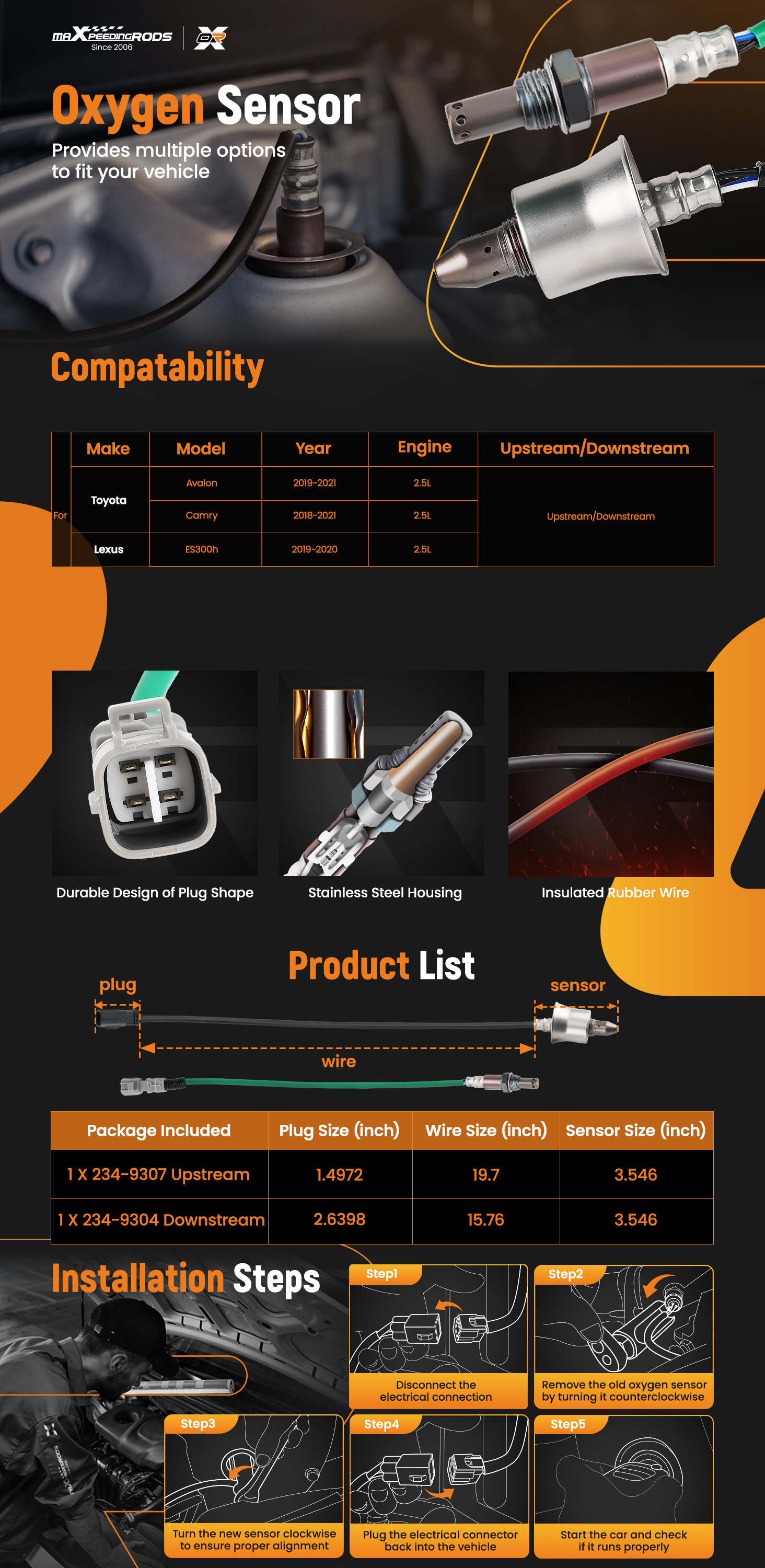 【High Quality Mateial】The oxygen sensor is equipped with a stainless steel housing. Durable and corrosion-resistant, ensuring your engine's long-lasting and stable performance.
