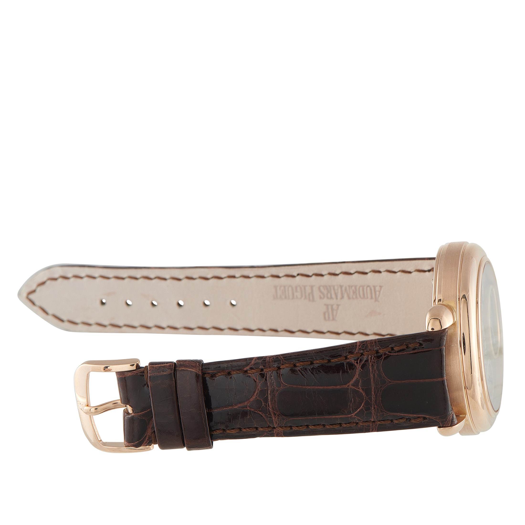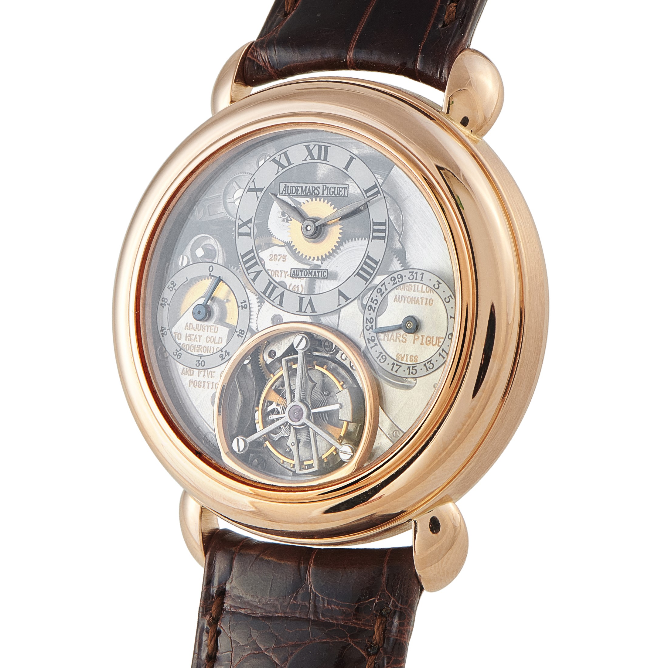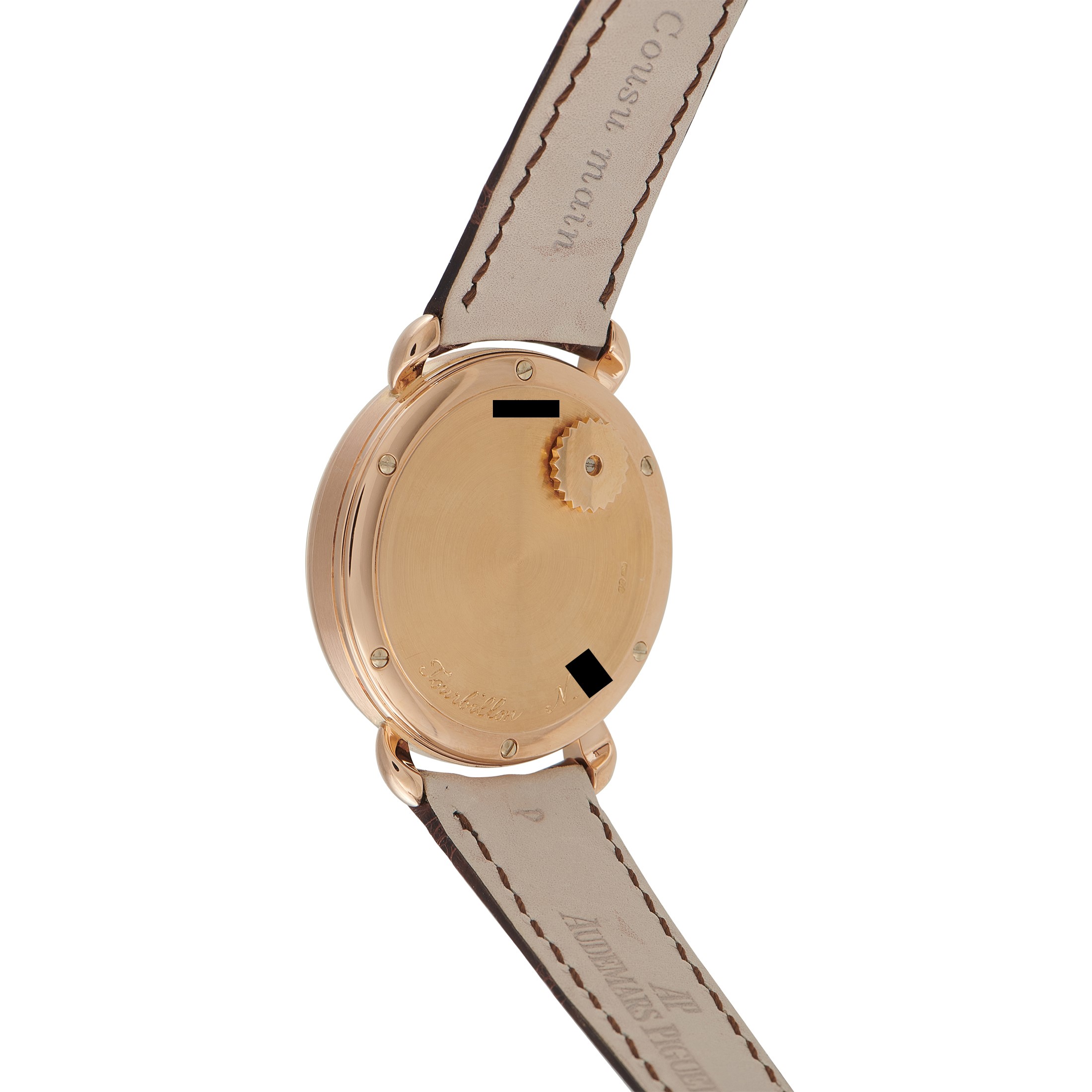 A rare masterpiece from the 1990s, this special edition reference from the Jules Audemars collection presents time in its most exposed form. It features a fully skeletonized display, revealing a tourbillon at 6, a power reserve indicator at 9, hour and minute at 12, and the date at 3. The 39mm rose gold case with bulla-style lugs and a double-stepped bezel houses a bumper automatic movement, caliber 2875, which provides a tactile winding experience using the hidden crown positioned at the caseback. This movement maintains a 54-hour power reserve.This pre-owned Audemars Piguet Jules Audemars Tourbillon 18K Rose Gold Special Edition Watch 25718OR.O.0002.01 is supplied with a watch travel case.