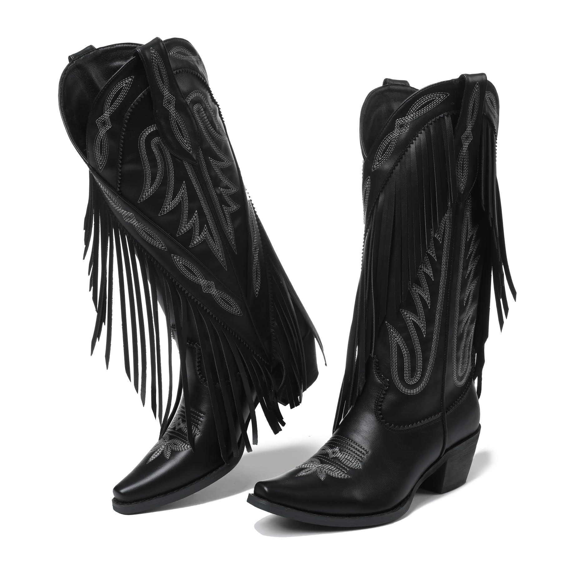 Grakihily Cowgirl Boots for Women Retro Pointed Toe Pull On Block Chunky Heel Embroide Tassel Country Concert Outfits Mid Calf Western Fringe Cowboy Boots,BlackPU Size 9.5