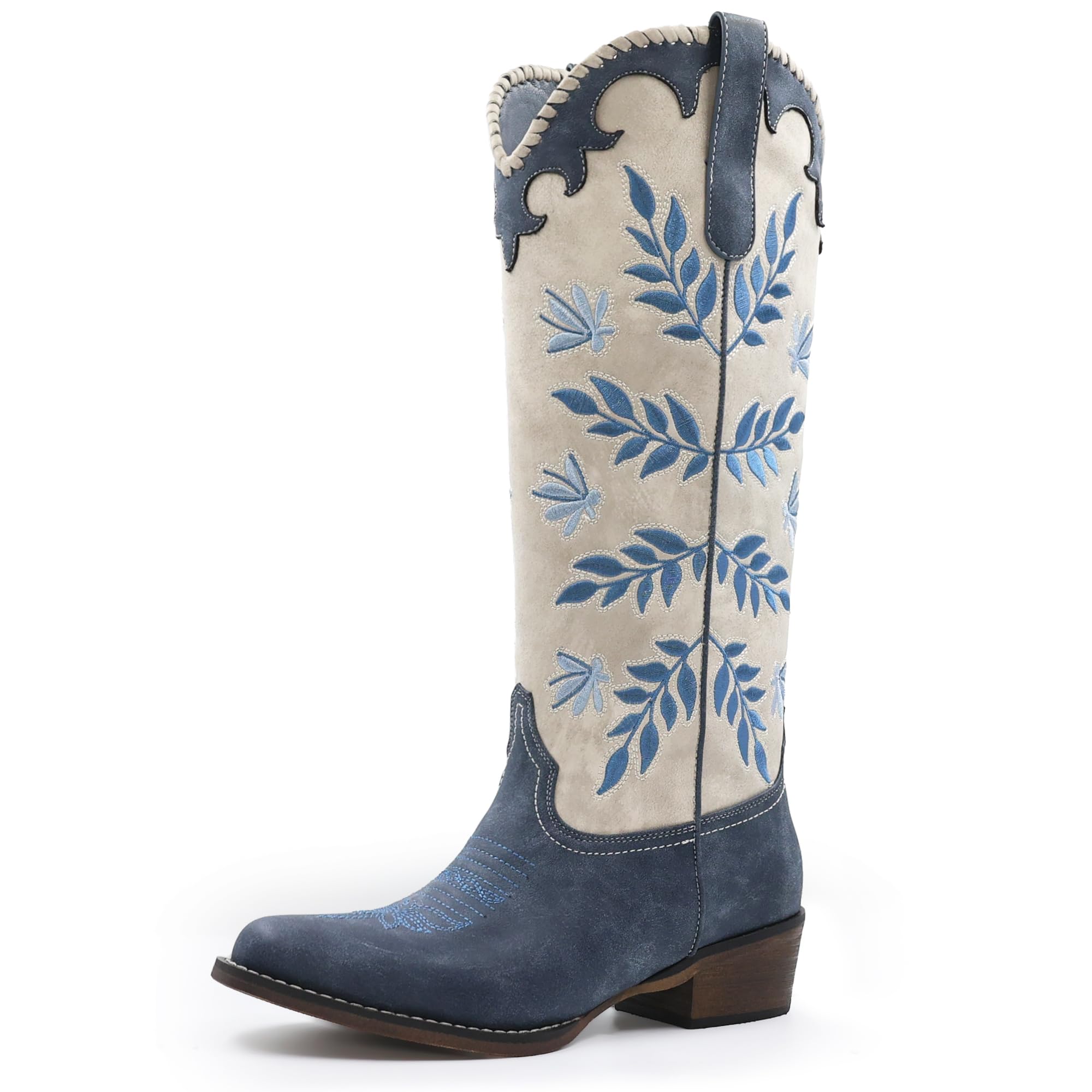 GPXGPX Womens Cowboy Boots Leaf Embroidered Knee High Boots Round Toe Chunky Heel Western Blue Cowgirl Riding Boots,Size 7