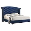 Accent your sleeping space like never before with this five-piece bedroom set. A dramatically large wingback headboard towers over the bed to make a grand display, featuring button tufting and nail head trim. A matching dresser comes equipped with six spacious drawers with nail head trim around the frame, coordinating with the matching mirror and five-drawer chest. The two-drawer nightstand is a must-have for storing bedside essentials. All pieces are upholstered in a luxurious velvet fabric.