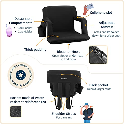 Enjoy maximum comfort at sports events, camping trips, or outdoor adventures with the Alpcour Reclining Stadium Seat. This 25-inch wide bleacher chair features thick cushioning and full back support, reducing fatigue on long game days or outdoor activities. With six reclining positions, foldable armrests, and multiple pockets—including side, back, and smartphone storage—this seat combines comfort and convenience. Made from waterproof polyester with an aluminum/steel frame, it stays stable on bleachers and resists rain or spills. Shoulder straps and adjustable buckle straps make it portable and easy to carry. Perfect for stadiums, concerts, kayaking, paddleboarding, picnics, or camping, it supports up to 440 pounds and enhances your outdoor seating experience.