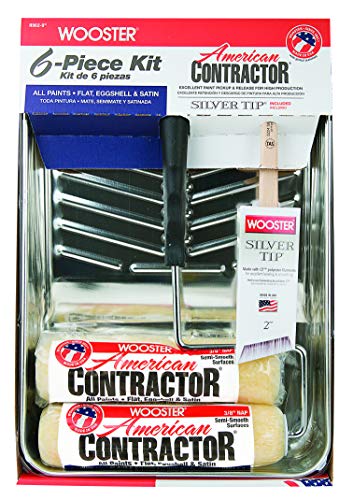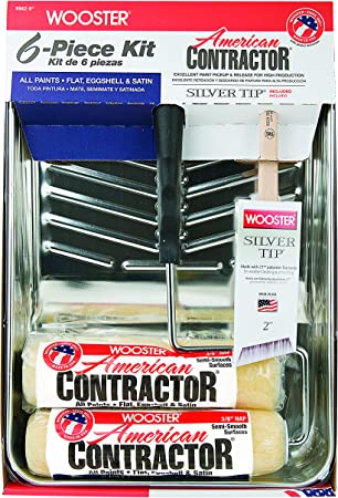 Includes (1) R962 9 inch Paint Supplies Kit. American Contractor 9" x 3/8" Nap & Silver Tip brush Kit. Each kit includes: American Contractor 9” x 3/8” Rollers (R562), Silver Tip 2" Thin Angle Sash Brush (5224-2"), 5-Wire Cage Frame, Deluxe Metal Tray (R402), and Deluxe Tray Liner (R406). For semi-smooth surfaces. Made in the USA.