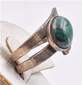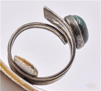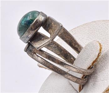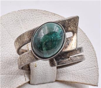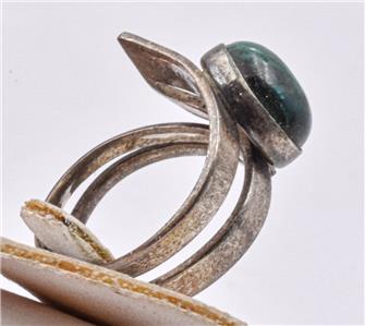 This is a very nice made in Israel ring, with a real green Eilat stone in the center, and a completely adjustable shank. It is currnetly a size 6, but is easiy adjustable. It is solid, and not lightweight. No damage or repair marks. This needs a light polishing, but nothing else.