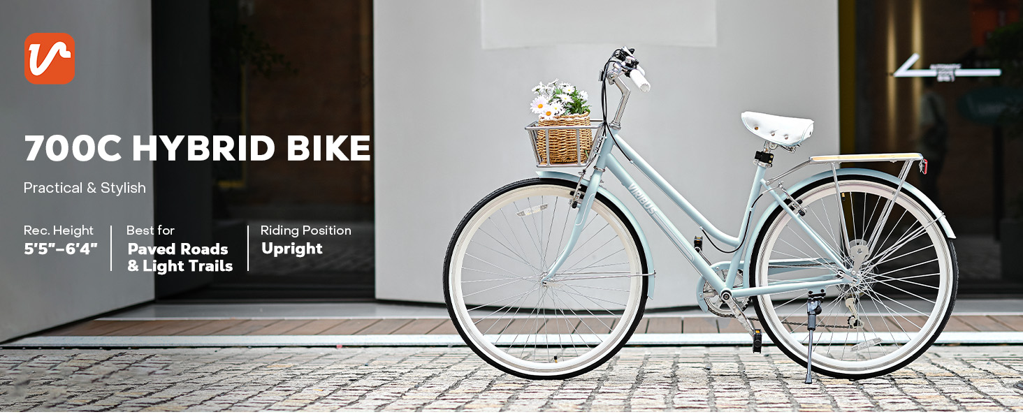 All-in-One Hybrid Experience: This 700c hybrid bike by Viribus combines stylish 700x35c wheels with a 7-speed derailleur, allowing any rider from 5′5″ to 6′4″ to enjoy the perfect sporty ride whether you're commuting, running errands, beach cruising, or exercising.